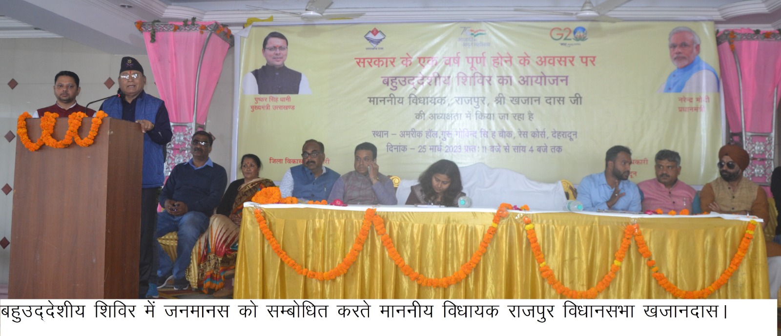 माननीय विधायक राजपुर ने खजानदास ने कहा कि बहुउद्देशीय शिविर के माध्यम से जनमानस की समस्या का उन्ही के क्षेत्र में निस्तारण हो इसके लिए उन्हें भटकना न पड़े इसके लिए राज्य सरकार द्वारा समस्त प्रदेश के विकासखण्ड स्तर पर बहुउद्देशीय शिविर का आयोजित किये जा रहा है। उन्होनें अधिकारियों को निर्देशित किया कि अधिकारी क्षेत्र की समस्याओं को प्राथमिकता से निस्तारण करें तथा क्षेत्रों में भ्रमण करें जिससे क्षेत्रवासियों को अपने ही क्षेत्र में समस्याओं का समाधान मिले अनावश्यक कार्यालयों के चक्कर न लगाने पड़े।