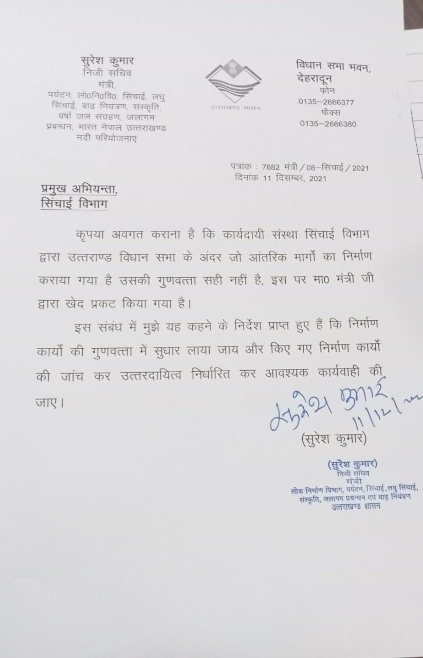 उन्होने प्रमुख अभियन्ता को जांच के आदेश देते हुए कहा कि उत्तराखंड विधानसभा परिसर के अन्दर बने आंतरिक मार्गों के निर्माण कार्यों की गुणवत्ता में सुधार लाया जाय और किए गए निर्माण कार्यों की जांच कर उत्तरदायित्व निर्धारित कर आवश्यक कार्यवाही की जाए।