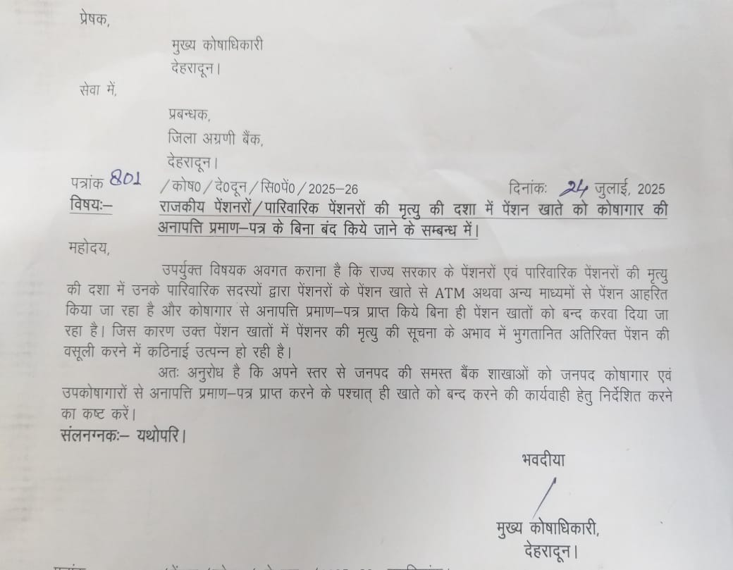 राजकीय पेंशनरों की मृत्यु होने पर खाता बंद करने से पूर्व बैंकों को कोषागार से लेना होगा अनापत्ति प्रमाण पत्र