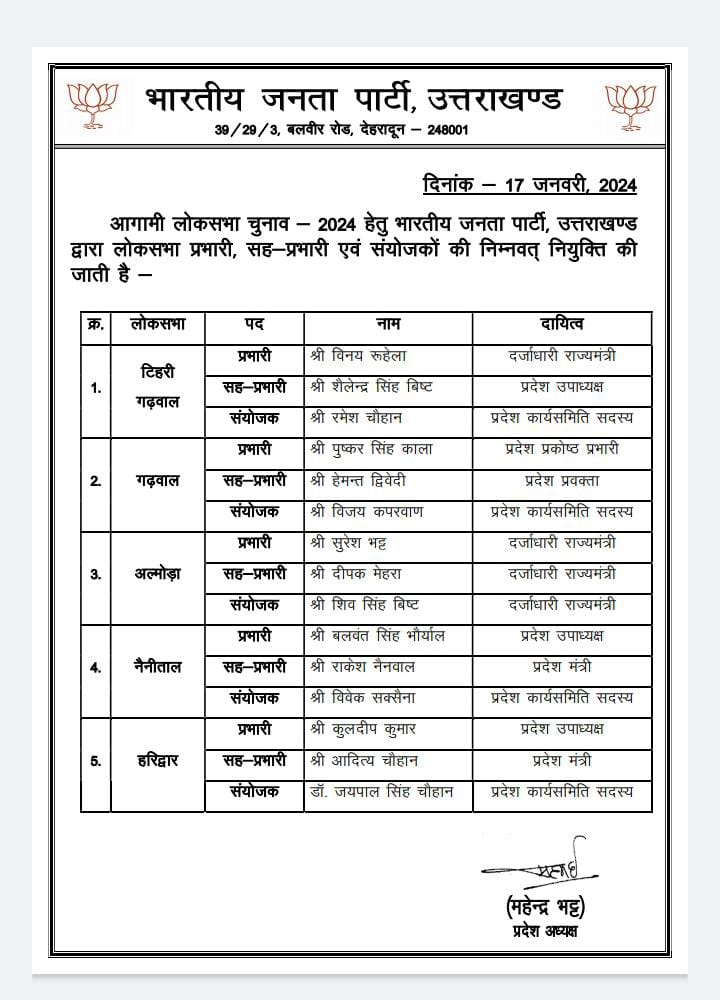 भारतीय जनता पार्टी ने लोकसभा चुनाव को लेकर अपनी तैयारियां शुरू कर दी हैं। केंद्रीय स्तर से मिलने वाले दिशा निर्देश हों या फिर ग्राउंड लेवल पर होने वाले कार्यक्रम, सभी को लेकर भाजपा ने अपनी तैयारी तेज कर ली है। इसी कड़ी में उत्तराखंड में बीजेपी ने पांचों लोकसभा सीटों को दो कलस्टर में बांटा है। साथ ही सरकार के दो मंत्रियों को इन दोनों कलस्टर की जिम्मेदारी दी गई है। वहीं, अब बीजेपी ने उत्तराखंड की पांचों लोकसभा सीटों पर प्रभारी, सह प्रभारी और संयोजक के रूप में पार्टी के वरिष्ठ नेताओं को तैनात कर दिया है।