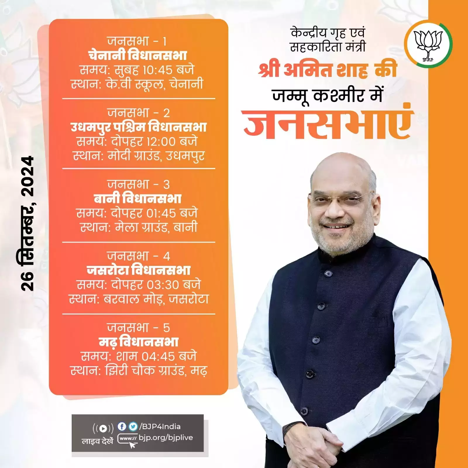भारतीय जनता पार्टी (भाजपा) के वरिष्ठ नेता, स्टार प्रचारक और केंद्रीय गृह एवं सहकारितामंत्री अमित शाह आज जम्मू-कश्मीर में चुनाव प्रचार करेंगे। वह राज्य के छह विधानसभा क्षेत्रों में जनसभाओं को संबोधित करेंगे। यह जानकारी भाजपा ने एक्स हैंडल पर साझा की है।