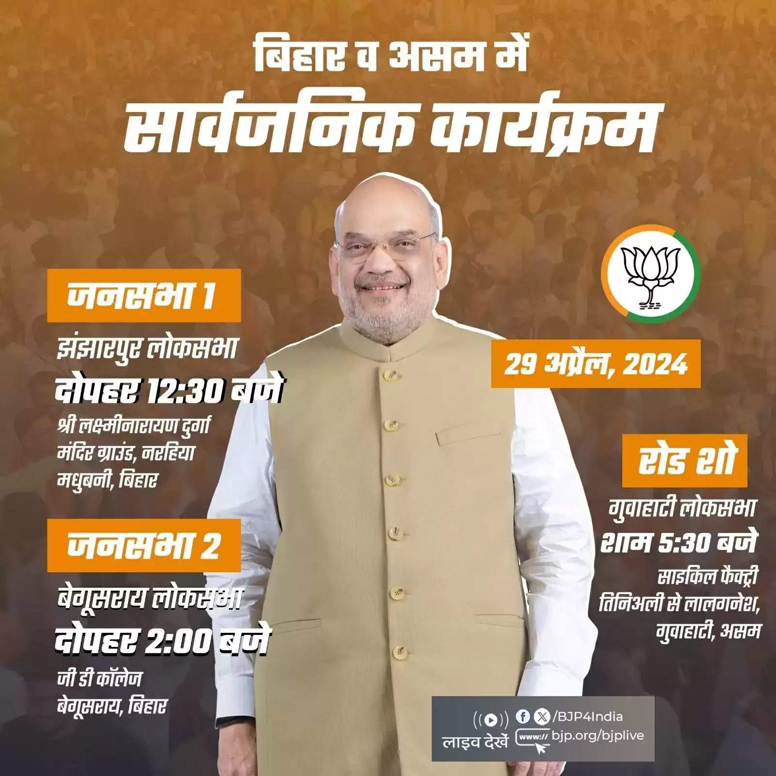 आम चुनाव में प्रधानमंत्री मोदी के 400 पार के संकल्प की पूर्ति के लिए शाह देशव्यापी दौरा कर रहे हैं। भाजपा के एक्स हैंडल के अनुसार, आज अमित शाह का चुनावी दौरा बिहार के झंझारपुर लोकसभा निर्वाचन क्षेत्र से शुरू होगा। वो दोपहर साढ़े 12 बजे मधुबनी के नरहिया स्थित श्रीलक्ष्मी नारायण दुर्गा मंदिर मैदान में जनसभा को संबोधित करेंगे। इसके बाद वो बेगूसराय जाएंगे। दोपहर दो बजे बेगूसराय के जेडी कालेज में होने वाली भाजपा की जनसभा को संबोधित करेंगे। शाह शाम साढ़े पांच बजे असम के गुवाहटी में रोड शो निकालेंगे। यह रोड शो साइकिल फैक्टरी तिनिअल से शुरू होकर लालगनेश में समाप्त होगा।