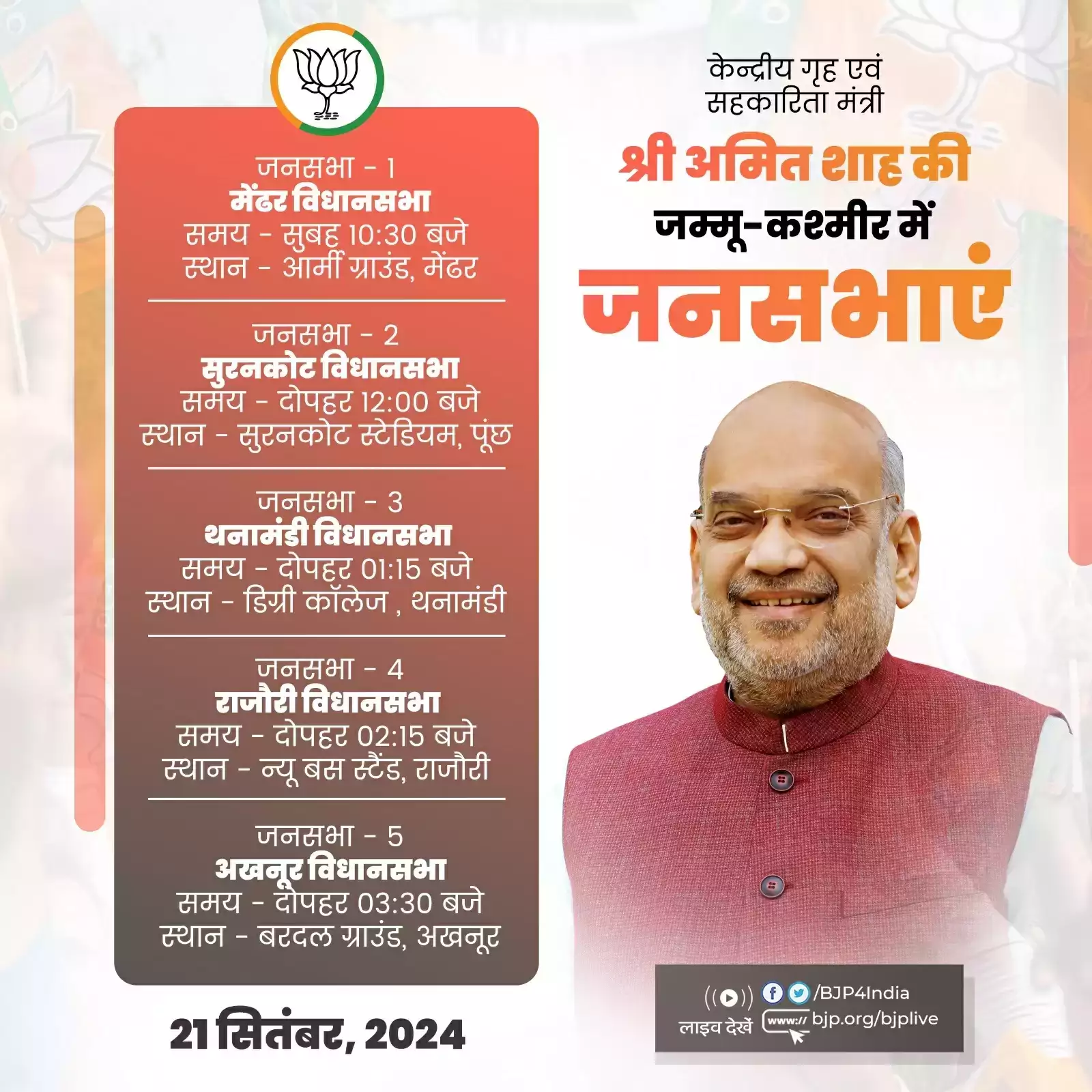 भारतीय जनता पार्टी (भाजपा) के वरिष्ठ नेता, स्टार प्रचारक, केंद्रीय गृह एवं सहकारितामंत्री अमित शाह आज जम्मू-कश्मीर के पांच विधानसभा क्षेत्रों में चुनाव प्रचार करेंगे। सुबह साढ़े 10 बजे वह इसकी शुरुआत मेंढर विधानसभा क्षेत्र से करेंगे। सबसे आखिर में वह अखनूर विधानसभा क्षेत्र के मतदाताओं से रूबरू होंगे। भारतीय जनता पार्टी ने एक्स हैंडल पर केंद्रीय गृह एवं सहकारितामंत्री अमित शाह के आज के कार्यक्रम को साझा किया है।