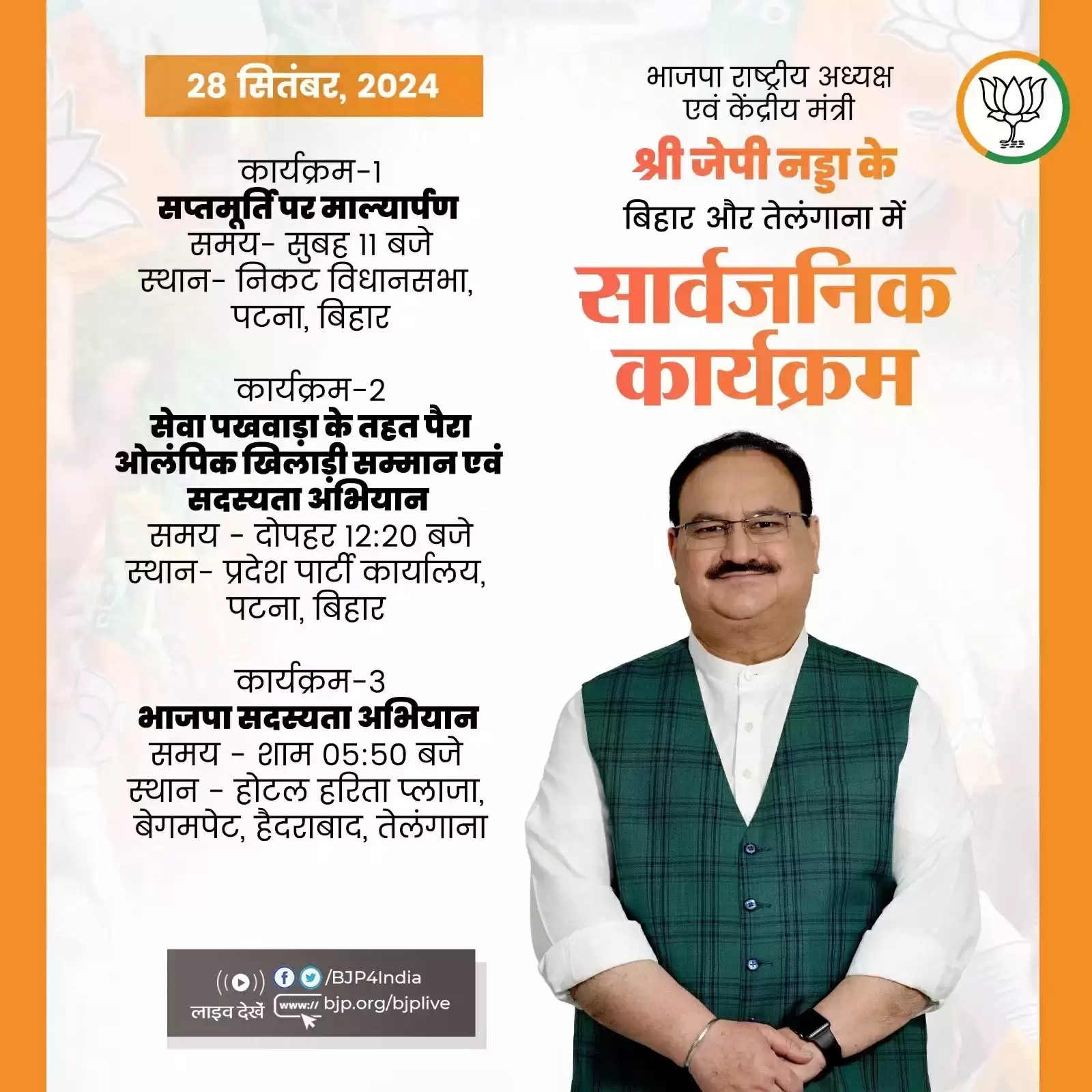 भाजपा के एक्स हैंडल के अनुसार, राष्ट्रीय अध्यक्ष जेपी नड्डा पूर्वाह्न 11 बजे पटना में बिहार विधानसभा के पास स्थापित सप्तमूर्ति पर माल्यार्पण करेंगे। ठीक 20 मिनट बाद वो प्रदेश भाजपा कार्यालय पहुंचेंगे। यहां पर नड्डा सेवा पखवाड़ा के तहत पैरा ओलंपिक खिलाड़ियों को सम्मानित करने बाद पार्टी के सदस्यता अभियान कार्यक्रम में हिस्सा लेंगे। भाजपा नेता जेपी नड्डा बिहार का दौरा पूरा कर शाम को तेलंगाना पहुंचेंगे। नड्डा 5ः50 बजे हैदराबाद के बेगम पेट स्थित होटल हरित में भाजपा के सदस्यता अभियान कार्यक्रम में हिस्सा लेंगे।
