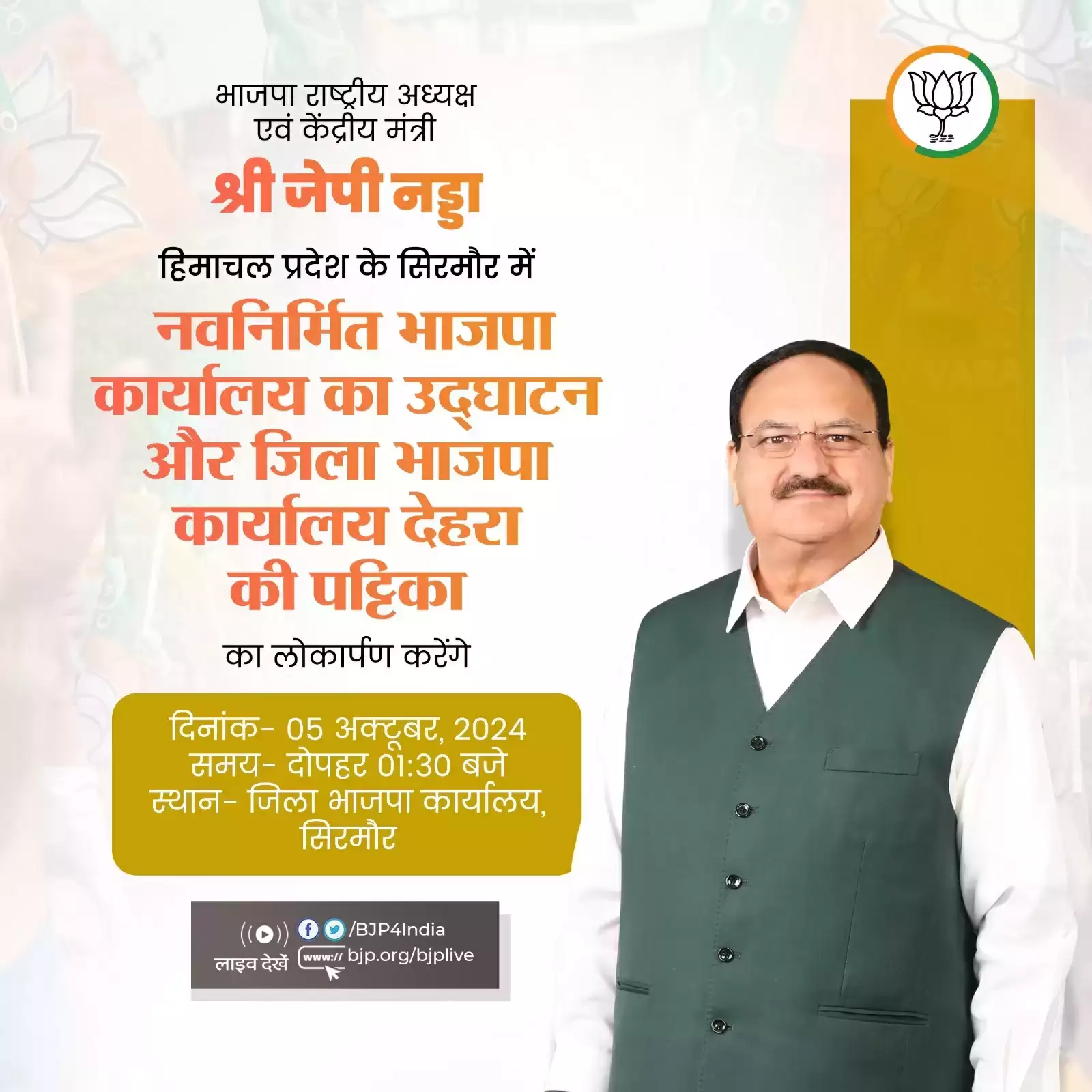 भाजपा के अनुसार, नड्डा दोपहर करीब 1ः30 बजे सिरमौर में पार्टी के नवनिर्मित जिला कार्यालय का उद्घाटन करेंगे। साथ ही जिला भाजपा कार्यालय देहरा की पट्टिका का लोकार्पण भी करेंगे।