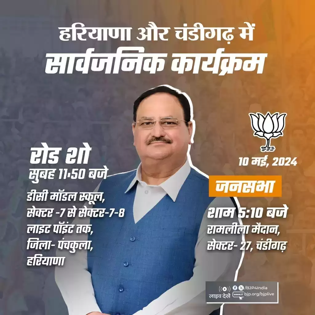 भाजपा के एक्स हैंडल के अनुसार, नड्डा पंचकूला में रोड शो करेंगे। रोड शो सुबह 11ः50 बजे डीसी मॉडल स्कूल सेक्टर-7 से शुरू होकर सेक्टर-7-8 लाइट प्वाइंट पर खत्म होगा। आखिर में नड्डा देश के खूबसूरत शहरों में शुमार और सिटी ब्यूटीफुल के नाम से विख्यात चंडीगढ़ के सेक्टर-27 स्थित रामलीला मैदान में भाजपा की विशाल जनसभा को संबोधित करेंगे। भाजपा ने यहां से वरिष्ठ नेता संजय टंडन को उम्मीदवार बनाया है।