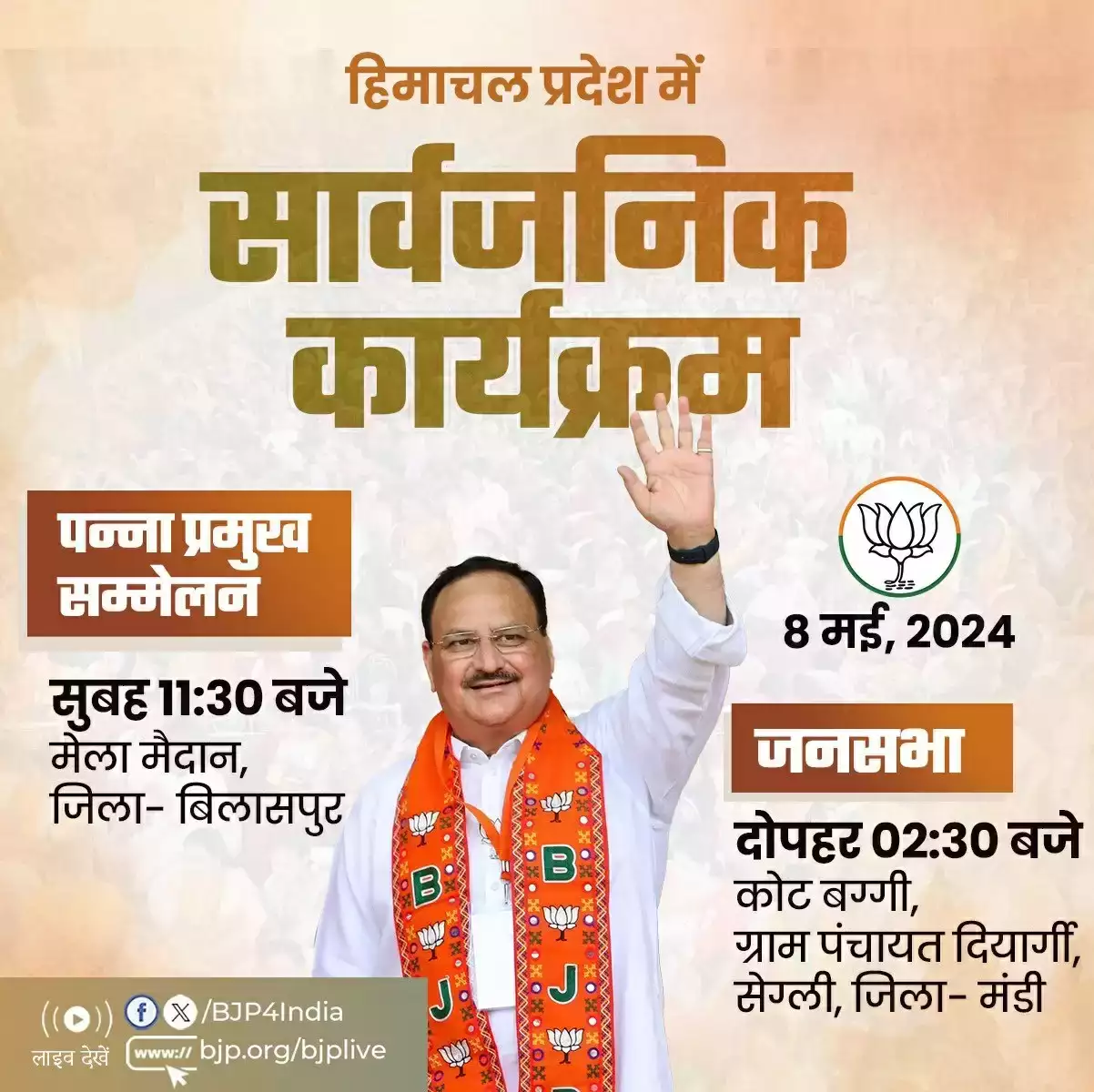 भाजपा के एक्स हैंडल के अनुसार, नड्डा सुबह 11ः30 बजे बिलासपुर के मेला मैदान में आयोजित पन्ना प्रमुख सम्मेलन में हिस्सा लेंगे। यहां के बाद वो छोटी काशी के नाम से मशहूर मंडी पहुंचेंगे। नड्डा मंडी जिले की दियार्गी-सेग्ली ग्राम पंचायत के कोट बग्गी में भाजपा की जनसभा को संबोधित करेंगे।