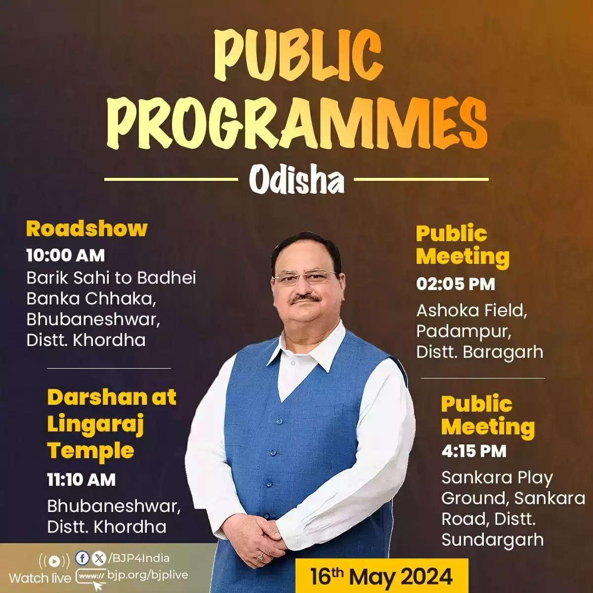 भाजपा के एक्स हैंडल के अनुसार नड्डा आज सबसे पहले सुबह 10 बजे खोर्धा जिले में रोड शो करेंगे। यह रोड शो ओडिशा की राजधानी भुवनेश्वर बारीक शाही से शुरू होगा। रोड शो का समापन बधेई बंका में होगा। इसके बाद नड्डा राजधानी के लिंगराज मंदिर जाएंगे। वह सुबह 11ः10 बजे भगवान लिंगराज के दर्शन करेंगे। जेपी नड्डा दोपहर दो बजकर पांच मिनट पर बरगढ़ और शाम सवा चार बजे सुंदरगढ़ में जनसभा को संबोधित करेंगे।