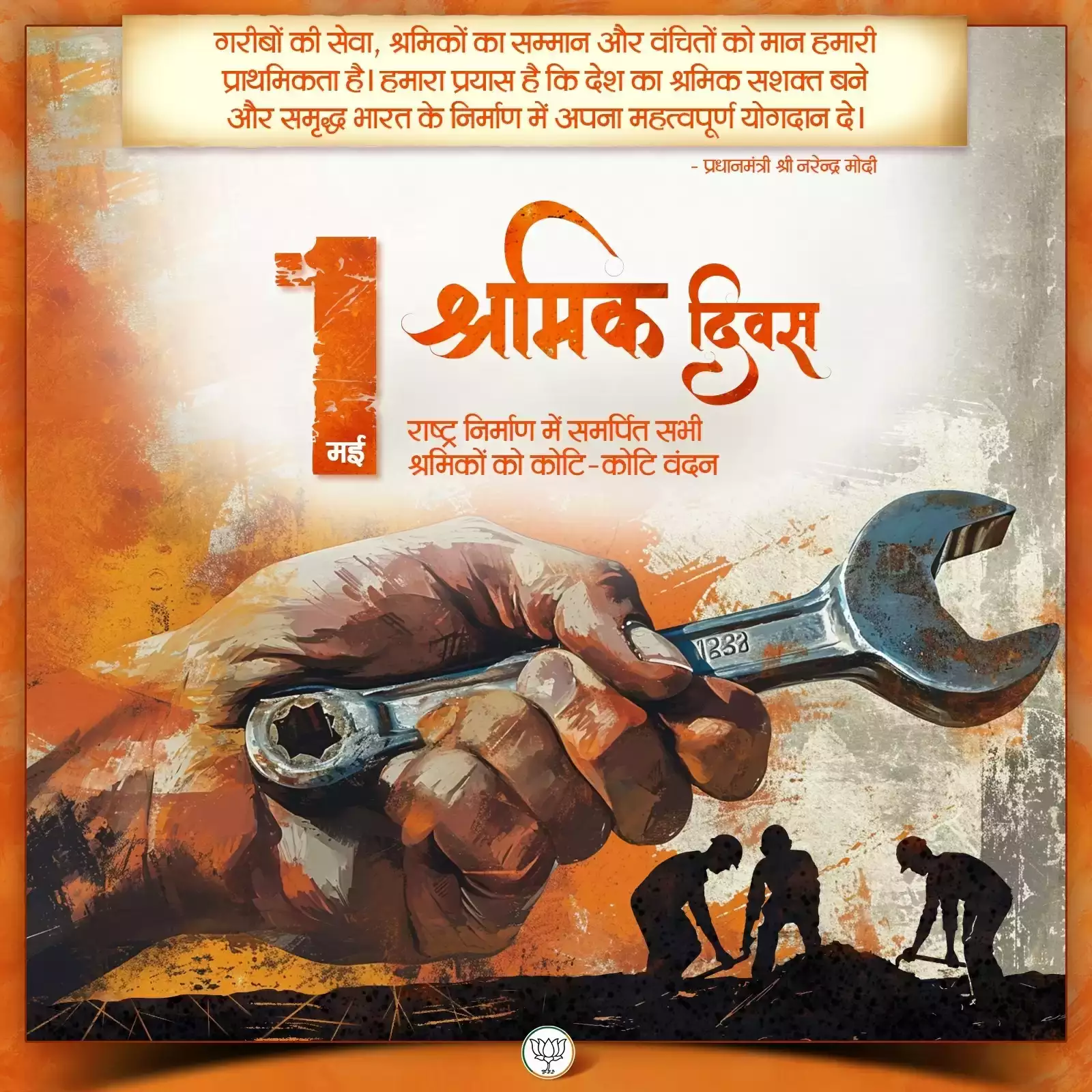 भारतीय जनता पार्टी ने एक्स हैंडल पर श्रमिक दिवस पर प्रतीकात्मक चित्र को प्रधानमंत्री नरेन्द्र मोदी के विचारों के साथ साझा किया है। भाजपा ने उद्धृत किया है-” गरीबों की सेवा, श्रमिकों का सम्मान और वंचितों का मान हमारी प्राथमिकता है। हमारा प्रयास है कि देश का श्रमिक सशक्त बने और समृद्ध भारत के निर्माण में अपना महत्वपूर्ण योगदान दे-प्रधानमंत्री नरेन्द्र मोदी। ”