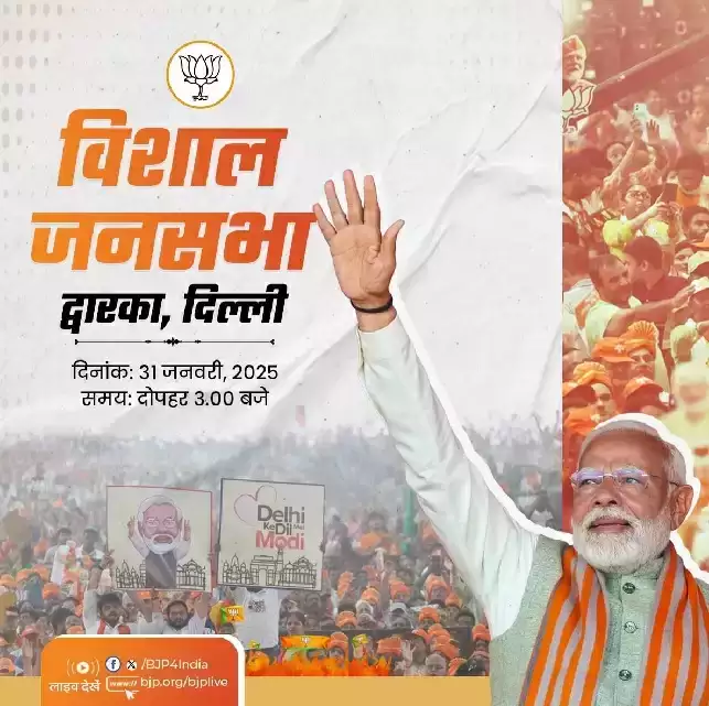 भारतीय जनता पार्टी (भाजपा) की आज दिल्ली के द्वारका में विशाल चुनावी जनसभा होने जा रही है। भाजपा के शीर्ष नेता, सबसे बड़े प्रचारक और प्रधानमंत्री नरेन्द्र मोदी द्वारका में होने वाली चुनाव जनसभा के मंच से राजधानी के मतदाताओं को बड़ा संदेश देंगे। यह जनसभा अपराह्न तीन बजे शुरू होगी। भाजपा ने एक्स हैंडल पर प्रधानमंत्री नरेन्द्र मोदी की जनसभा की जानकारी साझा की है।