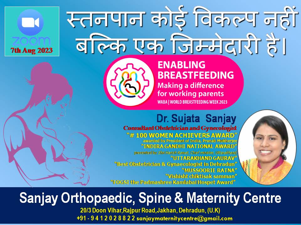 संजय ऑर्थोपीड़िक, स्पाइन एवं मैटरनिटी सेन्टर, जाखन, देहरादून द्वारा आयोजित वेविनार में राष्ट्रपति द्वारा सम्मानित डॉ. सुजाता संजय स्त्री एवं प्रसूति रोग विशेषज्ञा ने विश्व स्तनपान सप्ताह (1-7 अगस्त) को लेकर स्तनपान ओरिएंटेशन कार्यशाला वेबिनार का आयोजन किया। इस जन-जागरूकता व्याख्यान में उत्तरप्रदेश , उत्तराखण्ड, हिमाचल प्रदेश व पंजाब से 150 से अधिक मेडिकल, नर्सिंग छात्रों व किशोरियों ने भाग लिया।