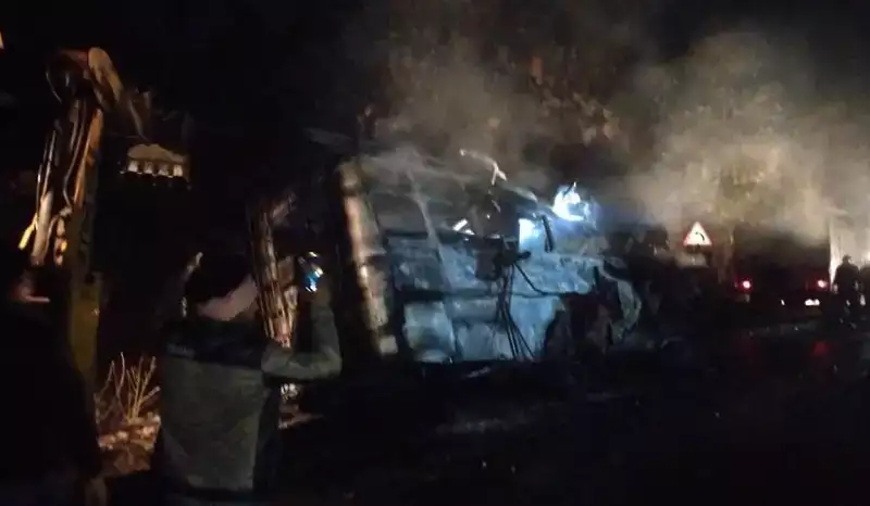 डंपर की टक्कर से बस में लगी आग, 12 लोग जिंदा जले, 15 झुलसे