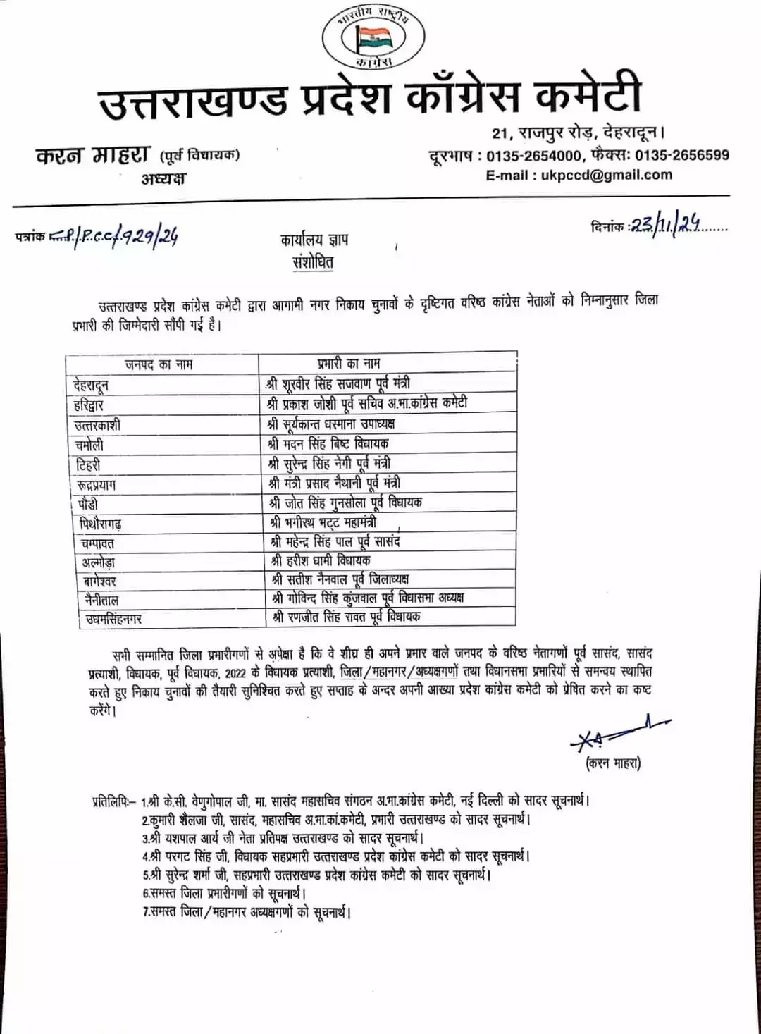 उत्तराखंड कांग्रेस के अध्यक्ष करन माहरा ने बताया कि देहरादून जनपद में पूर्व मंत्री शूरवीर सिंह सजवान को जिम्मेदारी दी गई है। हरिद्वार में वरिष्ठ नेता प्रकाश जोशी, उत्तरकाशी में सूर्यकांत धस्माना, चमोली में विधायक मदन सिंह बिष्ट, टिहरी में पूर्व मंत्री सुरेंद्र सिंह नेगी, रुद्रप्रयाग में पूर्व मंत्री मंत्री प्रसाद नैथानी, पौड़ी में पूर्व विधायक जोत सिंह गुनसोला को जिले का प्रभार दिया गया है। उन्होंने बताया कि इसी प्रकार कुमाऊं मंडल में पिथौरागढ़ जनपद में भागीरथ भट्ट को नेतृत्व सौंपा गया। चंपावत में पूर्व सांसद महेंद्र पाल सिंह, अल्मोड़ा में विधायक हरीश धामी, बागेश्वर में सतीश नैनवाल, नैनीताल में गोविंद सिंह कुंजवाल, उधम सिंह नगर में पूर्व विधायक रणजीत सिंह रावत को पार्टी की कमान सौंपी गई है।प्रदेश अध्यक्ष ने बताया कि कांग्रेस ने चुनाव की तैयारी में हर जिले के लिए अनुभवी नेताओं को उतारने का निर्णय लिया है। पार्टी का मानना है कि यह कदम निकाय चुनाव में कांग्रेस की स्थिति को मजबूत करने में अहम भूमिका निभाएगा।