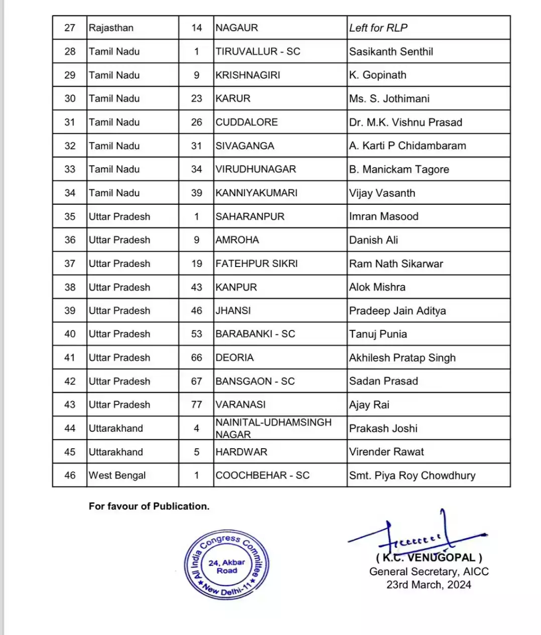 कांग्रेस ने दूसरी सूची में उत्तराखंड की कुल 5 लोकसभा सीटों में से तीन सीटों पर अपने कैंडिडेट उतारे थे। कांग्रेस नेतृत्व लंबे इंतजार के बाद शनिवार रात्रि उत्तराखंड के हरिद्वार लोकसभा सीट से पूर्व मुख्यमंत्री हरीश रावत के पुत्र वीरेंद्र रावत और नैनीताल ऊधमसिंह नगर लोकसभा सीट से प्रकाश जोशी को टिकट दिया है। इसी के साथ कांग्रेस ने राज्य की सभी पांचों सीटों पर उम्मीदवार घोषित कर दिया है।