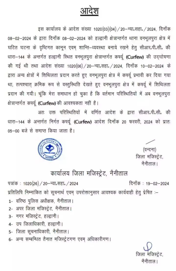 नैनीताल की जिलाधिकारी वंदना सिंह ने आदेश जारी करते हुए कहा कि बीती आठ फरवरी को बनभूलपुरा क्षेत्र में घटित घटना के दृष्टिगत कानून और शांति व्यवस्था बनाए रखने के लिए धारा-144 के अंतर्गत हल्द्वानी के बनभूलपुरा क्षेत्र में कर्फ्यू की घोषणा की गई थी। इस आदेश में कहा है कि बाद में बनभूलपुरा क्षेत्र में कर्फ्यू में ढील भी दी गई। वर्तमान परिस्थितियों में अब बनभूलपुरा में कर्फ्यू की जरूरत नहीं है, इसलिए धारा-144 के अंतर्गत निर्गत कर्फ्यू आदेश 20 फरवरी को प्रातः पांच बजे से समाप्त किया जाता है।