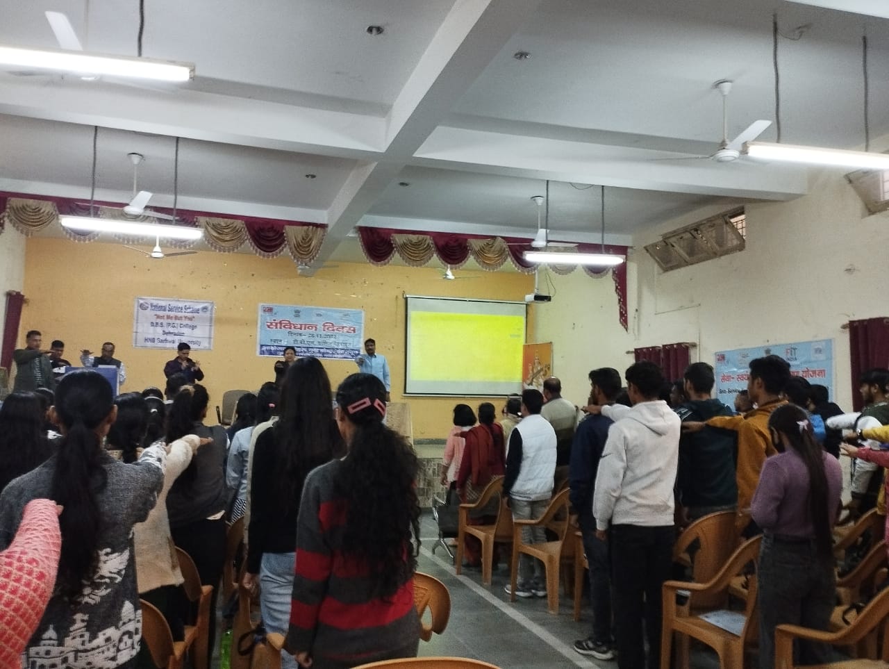 जिला युवा अधिकारी नेहरू युवा केन्द्र देहरादून श्रीमती एम0 टोलिया ने अवगत कराया है कि युवा कार्यक्रम एवं खेल मंत्रालय, भारत सरकार के तत्वावधान में डी0 बी0 एस0 कालेज, देहरादून के सभागार में 26 नवंबर 2022 को संविधान दिवस कार्यक्रम का आयोजन किया गया कार्यक्रम के मुख्य अथिति डॉ0 वी0सी0पाण्डे प्रचार्य डी0बी0एस0 कालेज के द्वारा द्वीप प्रज्जवलन कार कार्यक्रम का शुभआरम्भ किया गया। कार्यक्रम के अन्तर्गत संविधान की कहानियॉं,मौलिक कर्तव्य और दायित्व,प्रश्नोत्तरी एवं वार्तालाप गतिविधियों का आयोजन किया किया गया है। कार्यक्रम में राष्ट्रीय सेवा योजना के स्वयं सेवक एवं नेहरू युवा क्लब के 75 युवाओ द्वारा प्रतिभाग लिया गया इस अवसर पर कार्यक्रम अधिकारी डॉ विघुत बॉस द्वारा सविधान के मौलिक कर्तब्य और अधिकारो के बारे मे युवाओ को जानकारी दी गई डॉ शैली द्वारा प्रतिभागियो को पी0पी0टी0 के माध्यम से सविधान के बारे विस्तिरित जानकारी दी गई। इस अवसर पर उप प्राचार्य डॉ अनिल कुमार पाल,डॉ अराधना शर्मा द्वारा सविधान के बारे में युवाओ के सामाने अपने विचार रखे।और युवाओ द्वारा भी खुली चर्चा की गई बतौर मुख्य अथिति डॉ0 वी0सी0पाण्डे द्वारा युवाओं को सविधान दिवस पर डॉ0 भीमराव अम्बेडकर के योगदान के बारे में जानकारी दी गई कार्यक्रम का संचालन श्री अभिशेक द्वारा किया गया।