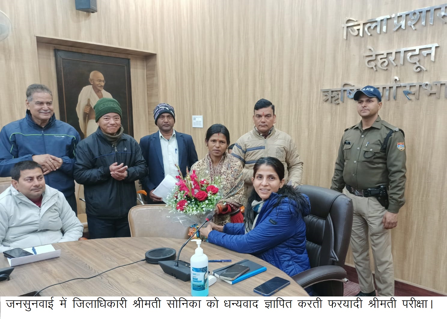 जनसुनवाई में आज 79 शिकायतें प्राप्त हुई, जिनमें अधिकतर मामले भूमि से संबंधित प्राप्त हुए इसके अतिरिक्त पेंशन, सड़क, आपदा, कोविड के दौरान राशन का भुगतान, शस्त्र लाइसेंस, गुमशुदा की तलाश करवाने, रास्ते पर गैराज बनाने, खोए हुए फोन को वापस दिलाने, जल जीवन मिशन के कार्यों की जांच कराने आदि शिकायतें प्राप्त हुई। जनसुनवाई के दौरान आज धर्मपुर निवासी फरयादी श्रीमती परीक्षा ने भूमि पर कब्जा दिलाए जाने पर जिलाधिकारी का धन्यवाद ज्ञापित किया। उन्होंने बताया कि उनके परिजनों द्वारा भूमि पर अवैध कब्जा किया गया था। जिस पर मा0 न्यायालय के आदेश के उपरान्त भी परिजन कब्जा नहीं दे रहे थे। जनसुनवाई में जिलाधिकारी ने कार्यवाही के निर्देशों के क्रम में जिला प्रशासन द्वारा उन्हें उनकी भूमि पर कब्जा दिलाया गया जिस पर उन्होंने जिलाधिकारी का धन्यवाद ज्ञापित किया।