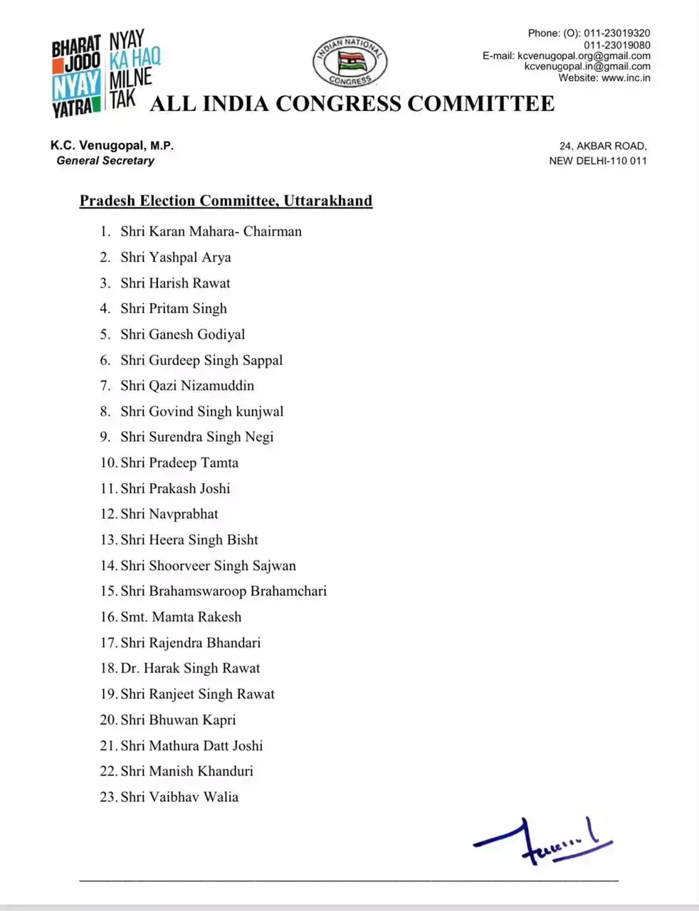 कांग्रेस के राष्ट्रीय महासचिव केसी वेणुगोपाल के हस्ताक्षरों से जारी समिति में जो अन्य नाम शामिल किए गए है उनमें गुरदीप सिंह सपल, काजी निजामुद्दीन, गोविंद सिंह कुंजवाल, सुरेंद्र सिंह नेगी, प्रदीप टम्टा, प्रकाश जोशी, नवप्रभात, हीरा सिंह बिष्ट, शूरवीर सिंह सजवाण, राजेंद्र भंडारी, हरक सिंह रावत, रणजीत सिंह रावत, भुवन कापड़ी, मथुरा दत्त जोशी तथा वैभव वालिया, सरोजनी कैंतुरा, गोदावरी थापली, अमर जीत सिंह, राजपाल बिष्ट और राजपाल खरोला के नाम के नाम शामिल है।