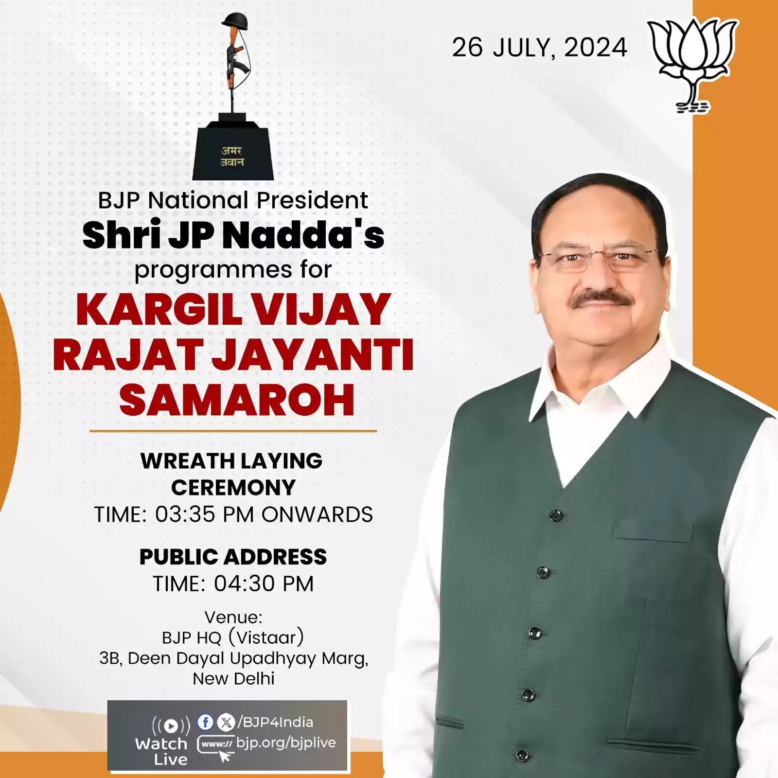 भाजपा ने पार्टी अध्यक्ष जेपी नड्डा के कार्यक्रम का विवरण एक्स हैंडल पर साझा किया है। उल्लेखनीय है कि भारतीय सेना ने कारगिल की लड़ाई में पाकिस्तान के छक्के छुड़ाते हुए 26 जुलाई 1999 को विजय प्राप्त की थी। यह युद्ध करीब दो माह लड़ा गया । प्रारम्भ में इसे पाकिस्तान की घुसपैठ माना गया, लेकिन नियंत्रण रेखा में खोज अभियान के बाद पाकिस्तान की नियोजित रणनीति का खुलासा हुआ। भारतीय सेना को अहसास हुआ कि हमले की योजना बड़े पैमाने पर की गई है।