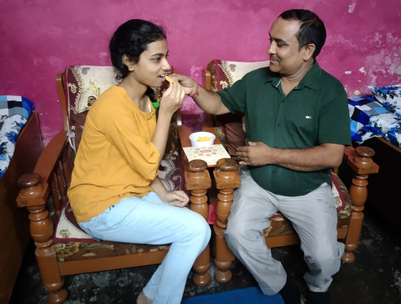 मेघा की सफलता पर परिवार के सदस्यों ने खुशी मनाई और मिठाई बांटी।