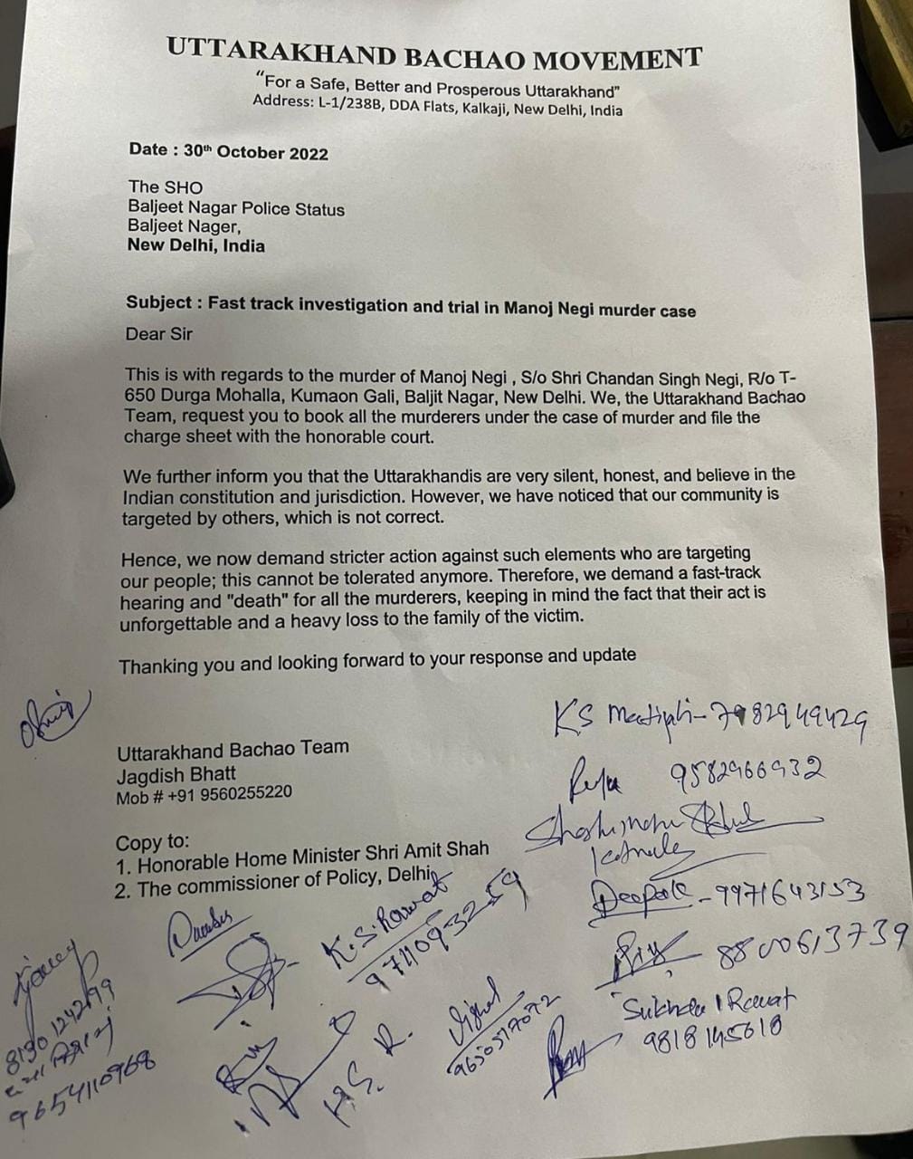 उत्तराखंड बचाओ आंदोलन के सदस्यों ने हस्ताक्षर अभियान चलाकर बलजीत नगर के इन्वेस्टिगेटिंग ऑफीसर कुलदीप शर्मा, एसएचओ -प्रवीण कुमार एवं एसीपी -दीपक चंद्रा को फास्टट्रैक इन्वेस्टिगेशन एवं ट्रायल के लिए दरखास्त दिया है। जगदीश भट्ट ने उत्तराखंड सरकार से भी अपील किया है कि ’उत्तराखंड सरकार को इस मामले को संज्ञान में लेना चाहिए साथ ही दिल्ली में रह रहे उत्तराखंड के लोगों की सुरक्षा को भी सुनिश्चित करें एवं मनोज नेगी हत्याकांड में दिल्ली प्रशासन से बात कर त्वरित कार्रवाई की अपील करें’। उन्होंने कहा कि मैं माननीय मुख्यमंत्री श्री पुष्कर सिंह धामी एवं हमारे उत्तराखंड से लोकसभा के सभी सांसदों से निवेदन है कि इस मामले में हस्तक्षेप करें एवं उत्तराखंड के लोगों को इंसाफ दिलाएं।