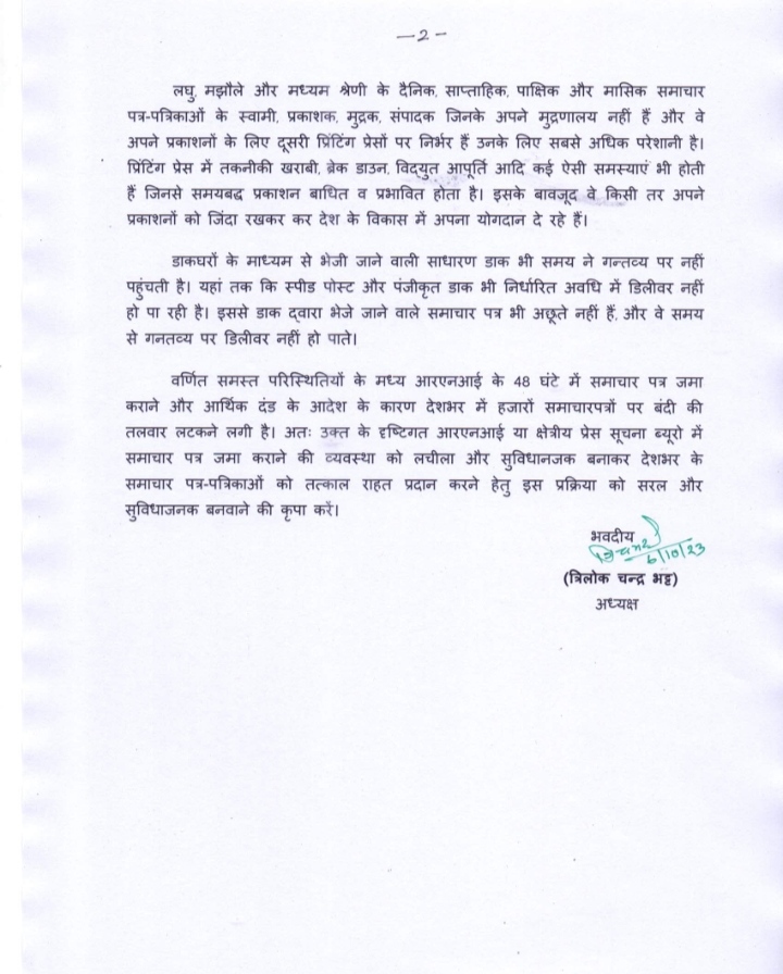 वर्णित समस्त परिस्थितियों के मध्य आरएनआई के 48 घंटे में समाचार पत्र जमा कराने और आर्थिक दंड के आदेश के कारण देशभर में हजारों समाचारपत्रों पर बंदी की तलवार लटकने लगी है। यूनियन द्वारा मांग की गयी है कि उक्त के दृष्टिगत आरएनआई या क्षेत्रीय प्रेस सूचना ब्यूरो में समाचार पत्र जमा कराने की व्यवस्था में राहत प्रदान करने हेतु इस प्रक्रिया को सरल और सुविधाजनक बनवाया जाय।