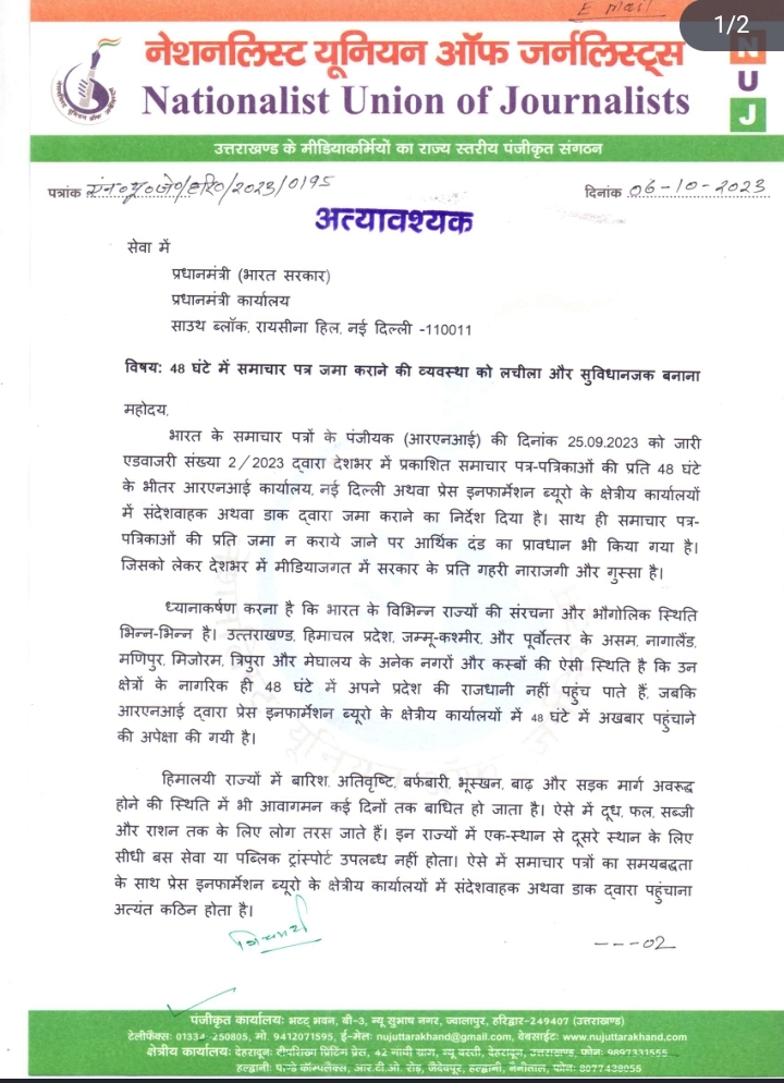 उत्तराखंड,हरिद्वार : नेशनलिस्ट यूनियन आफ जर्नलिस्ट्स’ (एनयूजे उत्तराखण्ड) ने देशभर में प्रकाशित समाचार पत्र-पत्रिकाओं की प्रति 48 घंटे के भीतर आरएनआई कार्यालय, नई दिल्ली अथवा प्रेस इनफार्मेशन ब्यूरो के क्षेत्रीय कार्यालयों में जमा कराने की प्रक्रिया को सरल और सुविधाजनक बनवाने की मांग की है।