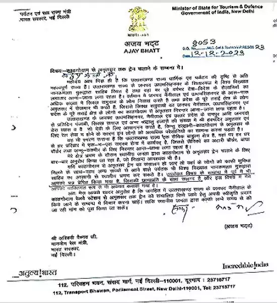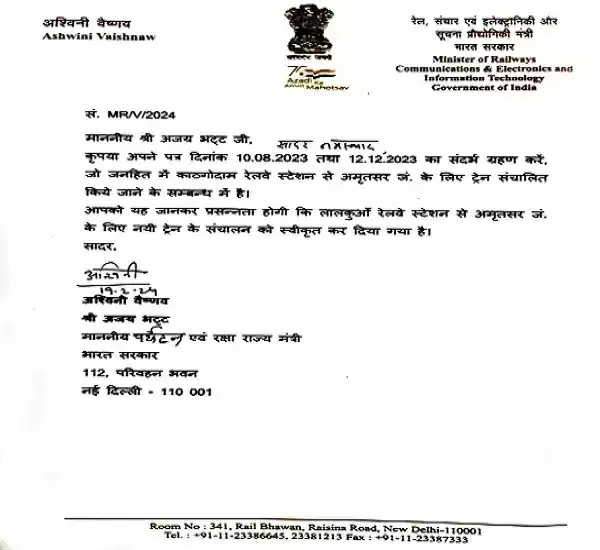 केंद्रीय राज्यमंत्री ने बताया कि काठगोदाम और अमृतसर के बीच ट्रेन संचालन का मामला 28 नवंबर 2019 को शून्य काल के दौरान संसद के प्रश्न काल के सत्र में उठाया था। इसके बाद लगातार वह कई बार रेल मंत्री से मिले और कई बार पत्र भी लिखे। दो दिन पूर्व भी भारतीय जनता पार्टी की राष्ट्रीय कार्यसमिति में पुनः रेल मंत्री से मुलाकात कर रेल संचालन के लिए आग्रह किया था, जिसके फलस्वरूप मंगलवार को कुमाऊं के लोगों के लिए खुशखबरी आई कि लालकुआं-अमृतसर के बीच ट्रेन संचालन को मंजूरी मिल गई है। अब रेल मंत्रालय की ओर से ट्रेन संचालन की मंजूरी प्रदान करने के साथ जल्द लालकुआं से अमृतसर के लिए नई ट्रेन चलेगी।