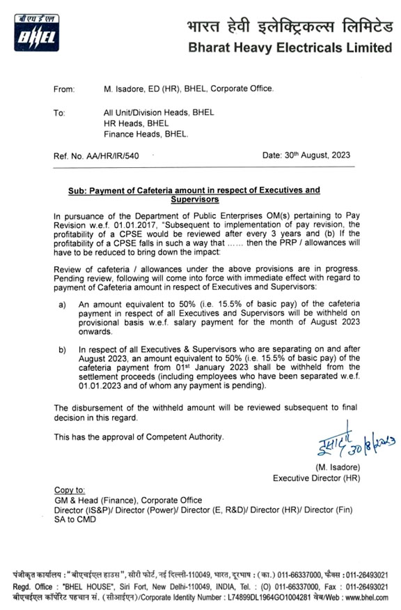 भेल के अफसरों और सुपरवाइजरों के भत्तों में भारी कटौती का फरमान जारी