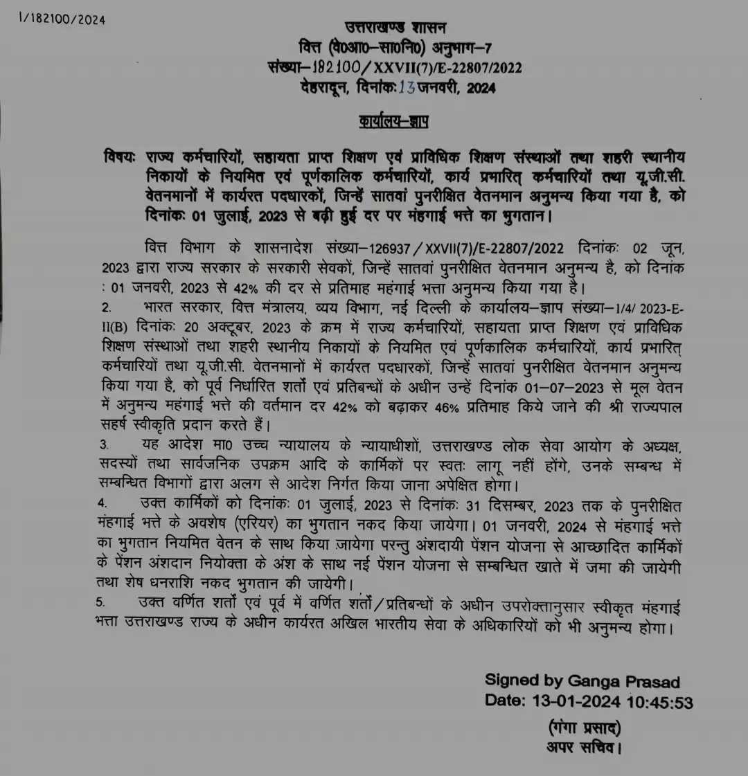अपर सचिव गंगा प्रसाद की ओर से जारी आदेश में कहा गया है कि राज्य सरकार के सरकारी सेवकों, जिन्हें सातवां पुनरीक्षित वेतनमान अनुमन्य है, उनको 01 जनवरी, 2023 से 42 फीसद की दर से प्रतिमाह महंगाई भत्ता अनुमन्य किया गया है। 20 अक्टूबर, 2023 के क्रम में राज्य कर्मचारियों, सहायता प्राप्त शिक्षण एवं प्राविधिक शिक्षण संस्थाओं और शहरी स्थानीय निकायों के नियमित एवं पूर्णकालिक कर्मचारियों को पूर्व निर्धारित शर्तों और प्रतिबन्धों के अधीन उन्हें 01 जुलाई 2023 से मूल वेतन में अनुमन्य महंगाई भत्ते की वर्तमान दर 42 फीसद को बढ़ाकर 46 फीसद प्रतिमाह करने की राज्यपाल सहर्ष स्वीकृति प्रदान किया है।
