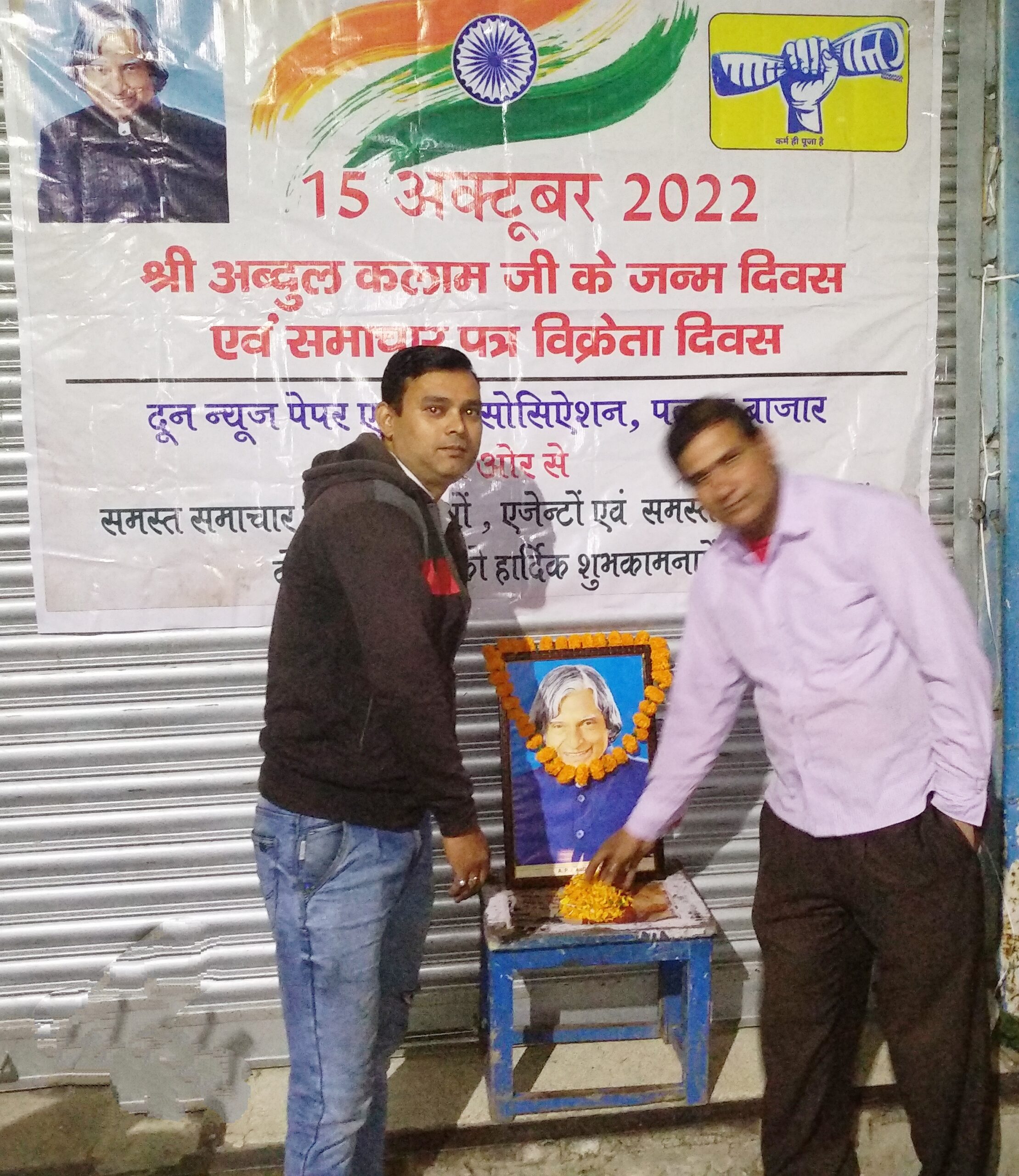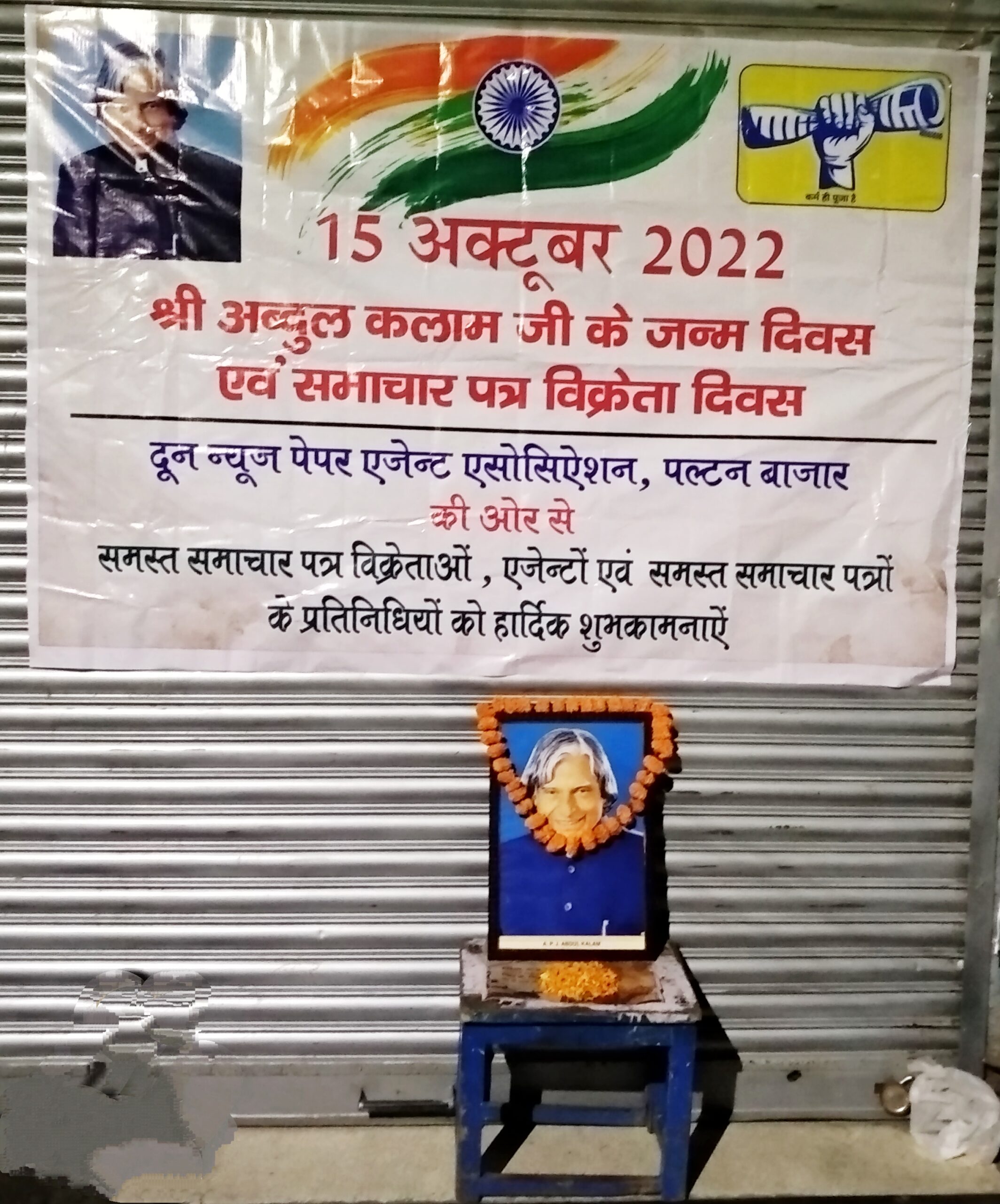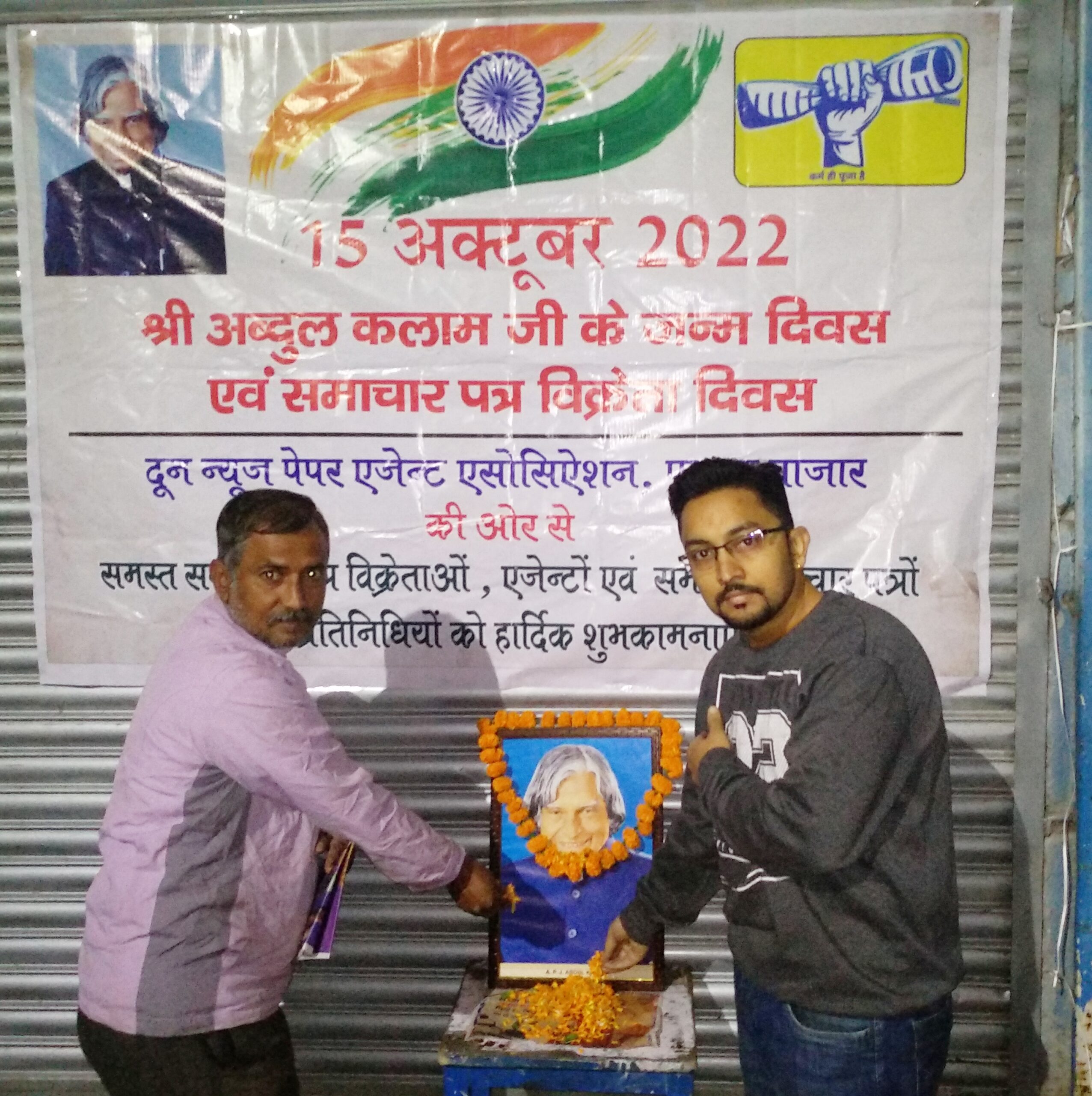 आज दून न्यूज पेपर एजेंट एसोसियेशन के सभी समाचार पत्र विक्रेता पल्टन बाजार सेंटर में सुबह 5.30 बजे एकत्र हुए। सभी समाचार पत्र विक्रेताओ ने भारत महान वैज्ञानिक व राष्ट्रपति अब्दुल कलाम जी का जन्मदिन मनाया।