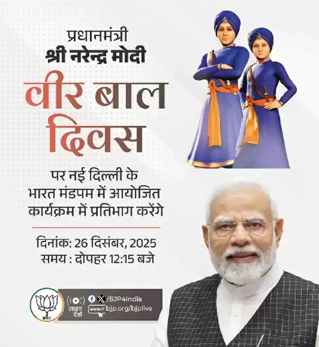 प्रधानमंत्री नरेन्द्र मोदी आज दोपहर नई दिल्ली के भारत मंडपम में वीर बाल दिवस के उपलक्ष्य में आयोजित राष्ट्रीय कार्यक्रम में हिस्सा लेंगे। प्रधानमंत्री दोपहर लगभग सवा 12 बजे कार्यक्रम को संबोधित करेंगे। भारतीय जनता पार्टी (भाजपा) ने प्रधानमंत्री नरेन्द्र मोदी के आज के इस कार्यक्रम की सचित्र सूचना अपने विभिन्न सोशल मीडिया अकाउंट पर साझा की है। आधिकारिक विज्ञप्ति में वीर बाल दिवस के महत्व की भी चर्चा की गई है।