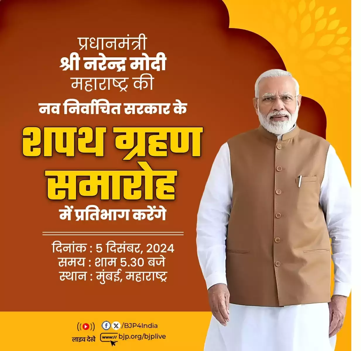 प्रधानमंत्री नरेन्द्र मोदी आज महाराष्ट्र की नई सरकार के शपथ ग्रहण समारोह में मौजूद रहेंगे। शपथ ग्रहण समारोह आज शाम साढ़े पांच बजे दक्षिण मुंबई के आजाद मैदान में होगा। इस भव्य समारोह में राजगशासित 19 राज्यों के मुख्यमंत्रियों को भी आमंत्रित किया गया है। कई केंद्रीयमंत्री भी उपस्थित रहेंगे। प्रधानमंत्री नरेन्द्र मोदी के इस कार्यक्रम की सूचना भारतीय जनता पार्टी (भाजपा) ने अपने एक्स हैंडल पर दी है।