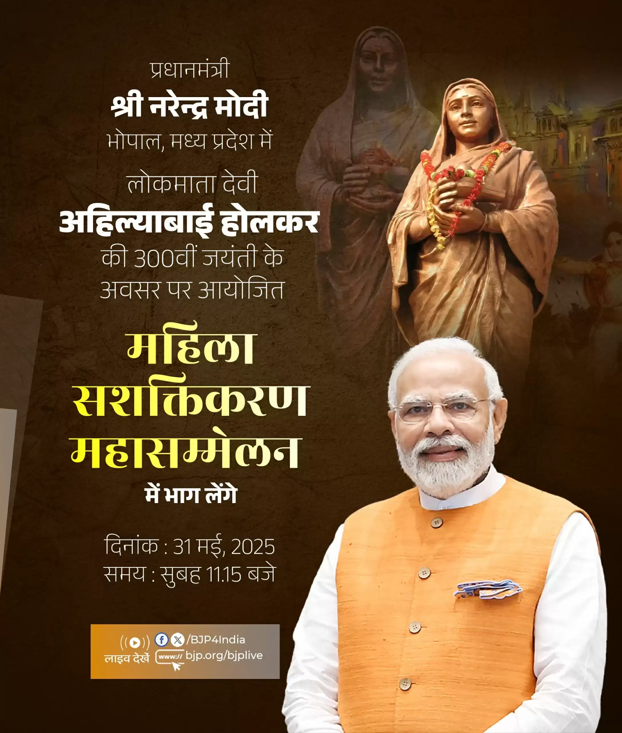 प्रधानमंत्री नरेन्द्र मोदी आज मध्य प्रदेश की राजधानी भोपाल में लोकमाता देवी अहिल्या बाई महिला सशक्तिकरण महासम्मेलन में हिस्सा लेंगे। यह महासम्मेलन देवी अहिल्या बाई होलकर की 300वीं जयंती को समर्पित है। भारतीय जनता पार्टी (भाजपा) ने प्रधानमंत्री मोदी के आज के कार्यक्रम को उनके चित्र के साथ एक्स पर साझा किया है।