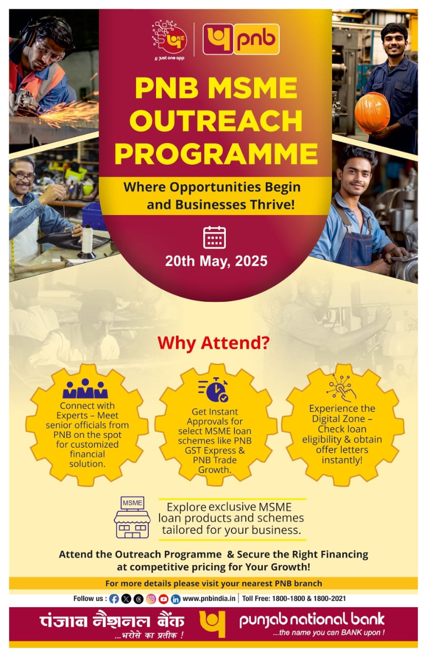 सार्वजनिक क्षेत्र में देश के अग्रणी बैंकों में से एक, पंजाब नेशनल बैंक (पीएनबी) ने अपना व्यापक मासिक एमएसएमई आउटरीच कार्यक्रम पेश किया है। यह 20.05.2025 को आयोजित होने वाली एक देशव्यापी रणनीतिक पहल है जो पूरे भारत के एमएसएमई ग्राहको को अनुकूलित वित्तीय समाधान पेश करेगी।