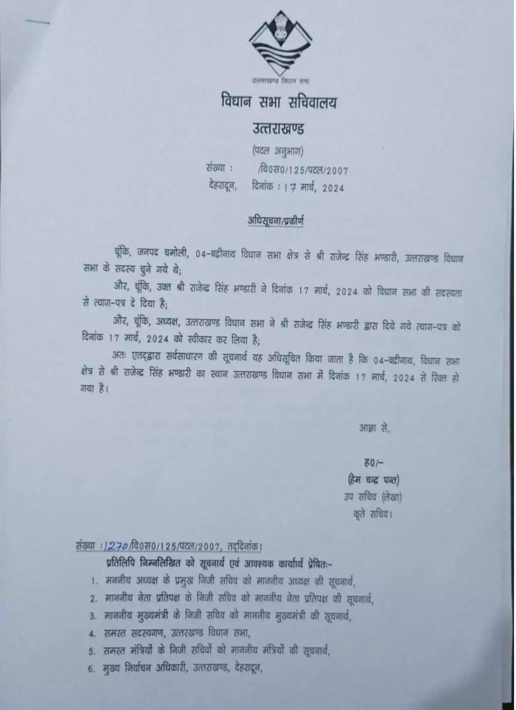 उत्तराखंड विधानसभा के उप सचिव हेम पंत की ओर से जारी अधिसूचना में बताया गया है कि जनपद चमोली, 04-बद्रीनाथ विधान सभा क्षेत्र से राजेन्द्र सिंह भण्डारी, उत्तराखण्ड विधान सभा के सदस्य चुने गये थे। राजेन्द्र सिंह भण्डारी ने 17 मार्च (रविवार) को विधानसभा की सदस्यता से त्याग-पत्र दे दिया है। विधानसभा ने राजेन्द्र सिंह भण्डारी के त्याग-पत्र को स्वीकार कर लिया है। इसी के साथ राजेन्द्र सिंह भण्डारी का स्थान उत्तराखण्ड विधान सभा में रिक्त हो गया है।