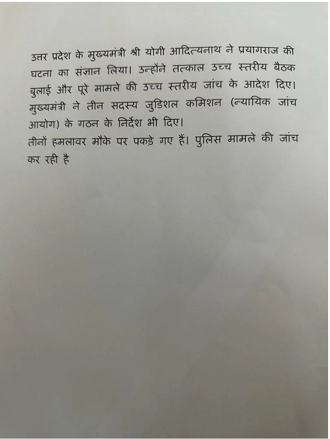 विशेष पुलिस महानिदेशक (कानून-व्यवस्था) प्रशांत कुमार ने एक बयान जारी कर कहा, ‘‘उत्तर प्रदेश के मुख्‍यमंत्री योगी आदित्‍यनाथ ने प्रयागराज की घटना का संज्ञान लिया है. उन्होंने तत्काल उच्‍च स्‍तरीय बैठक बुलाई और पूरे मामले की उच्‍च स्‍तरीय जांच के आदेश दिये हैं.’’ बयान के अनुसार मुख्यमंत्री ने तीन सदस्यीय न्यायिक जांच आयोग के गठन के भी निर्देश दिये हैं.
