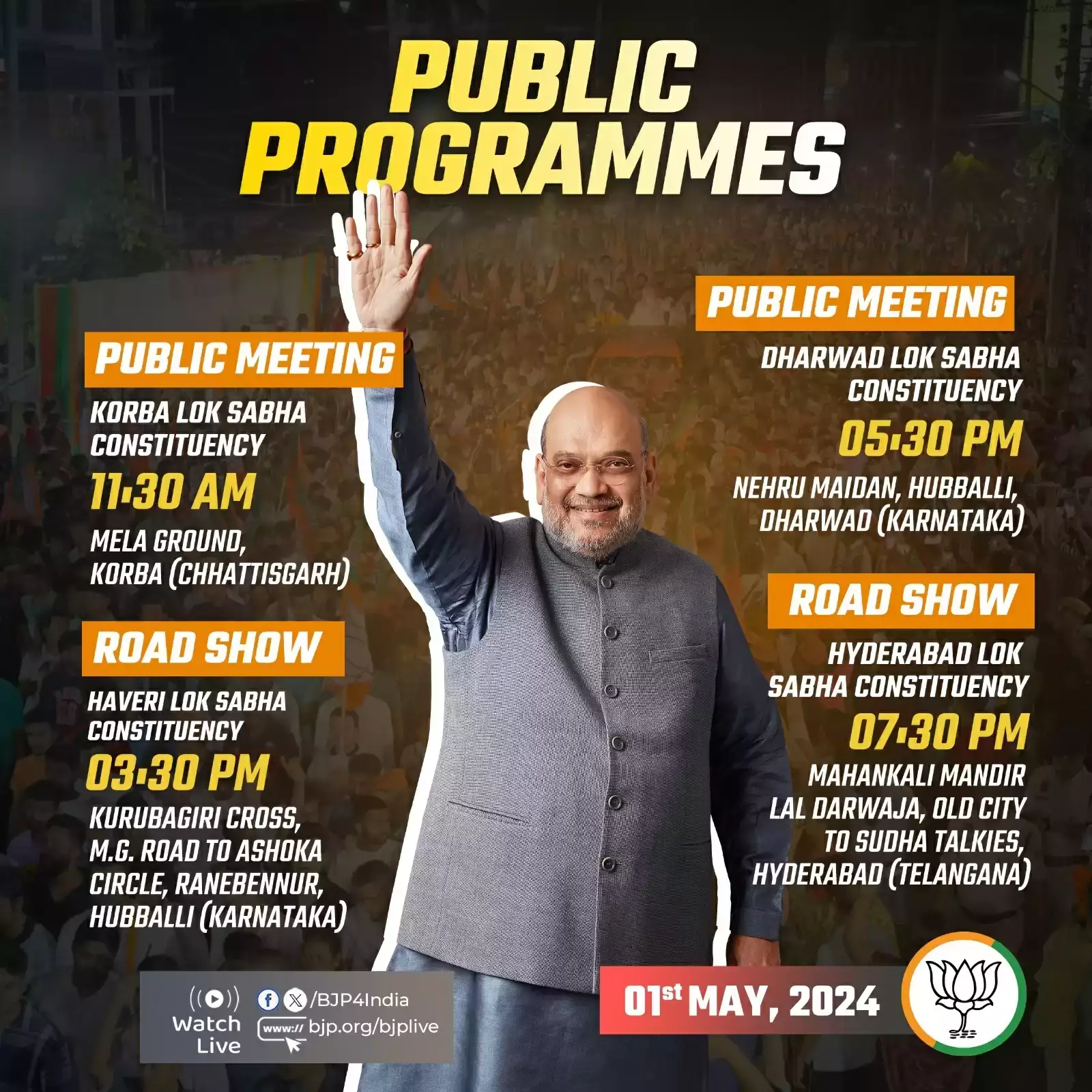 इसके बाद शाह कर्नाटक रवाना होंगे। वो कर्नाटक के हुब्बाली में हावेरी लोकसभा सीट के उम्मीदवार के लिए प्रचार के दौरान दोपहर 3ः30 बजे से रोड शो करेंगे। इसके बाद शाह कर्नाटक के ही धारवाड़ में शाम साढ़े पांच बजे चुनावी जनसभा को संबोधित करेंगे। इसके बाद शाह तेलंगाना का रुख करेंगे। शाह हैदराबाद में शाम करीब 7ः30 बजे से रोड शो करेंगे। यहां से भाजपा उम्मीदवार माधवी लता हैं।