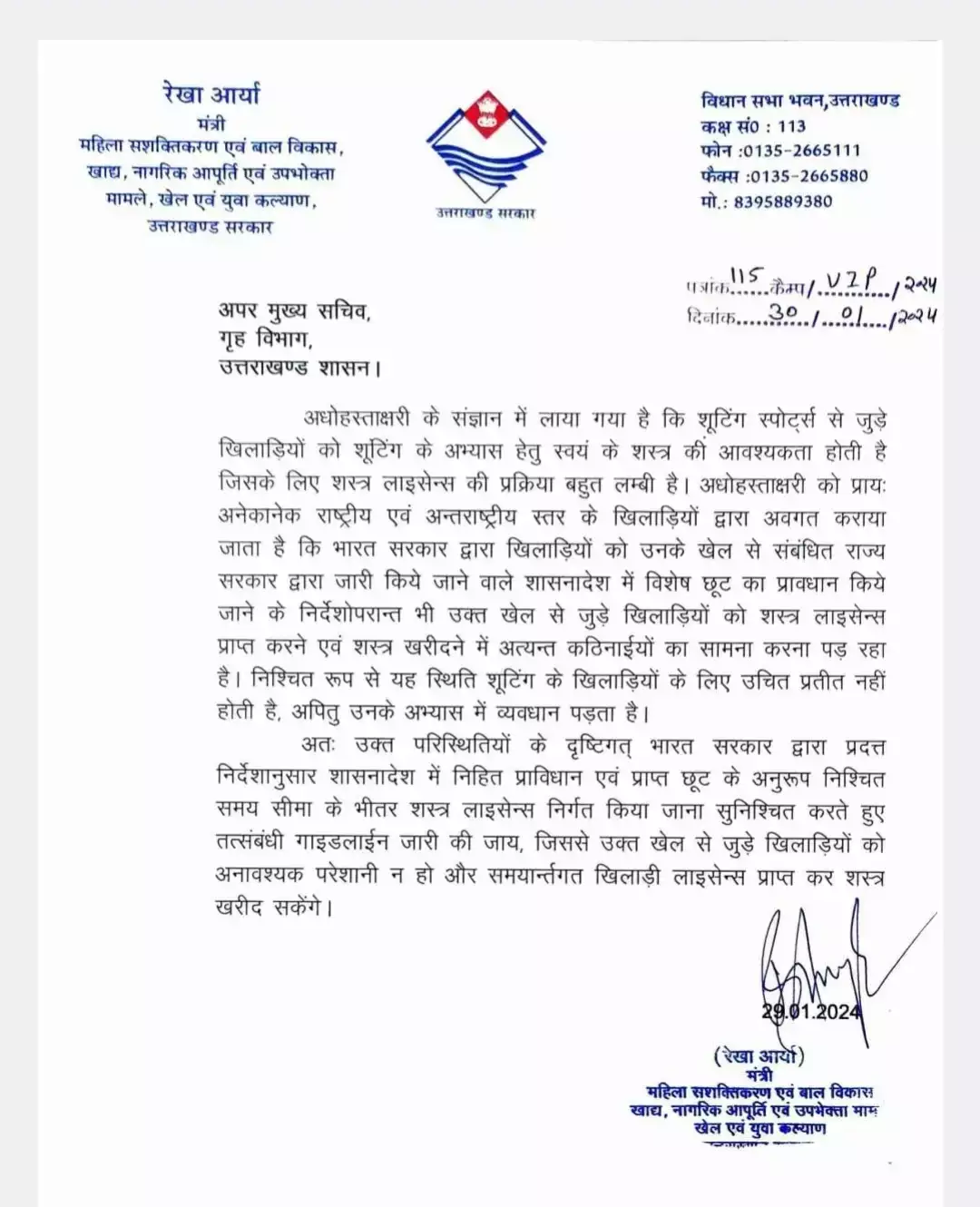 खेल मंत्री रेखा आर्या ने उक्त विषय का संज्ञान लेते हुए सचिव गृह और पुलिस महानिदेशक को पत्र लिखा है।इस पत्र के माध्यम से उन्होंने कहा कि अभी तक जो भी शूटिंग से सम्बंधित खिलाड़ी होते हैं, उन्हें अभ्यास के लिए शस्त्र लाइसेंस की अनुमति नही मिलती थी। ऐसे में अब उनके ओर से यह पत्र लिखा गया है। इससे जल्द ही शूटिंग के खिलाड़ियों को शस्त्र लाइसेंस प्राप्त होंगे।