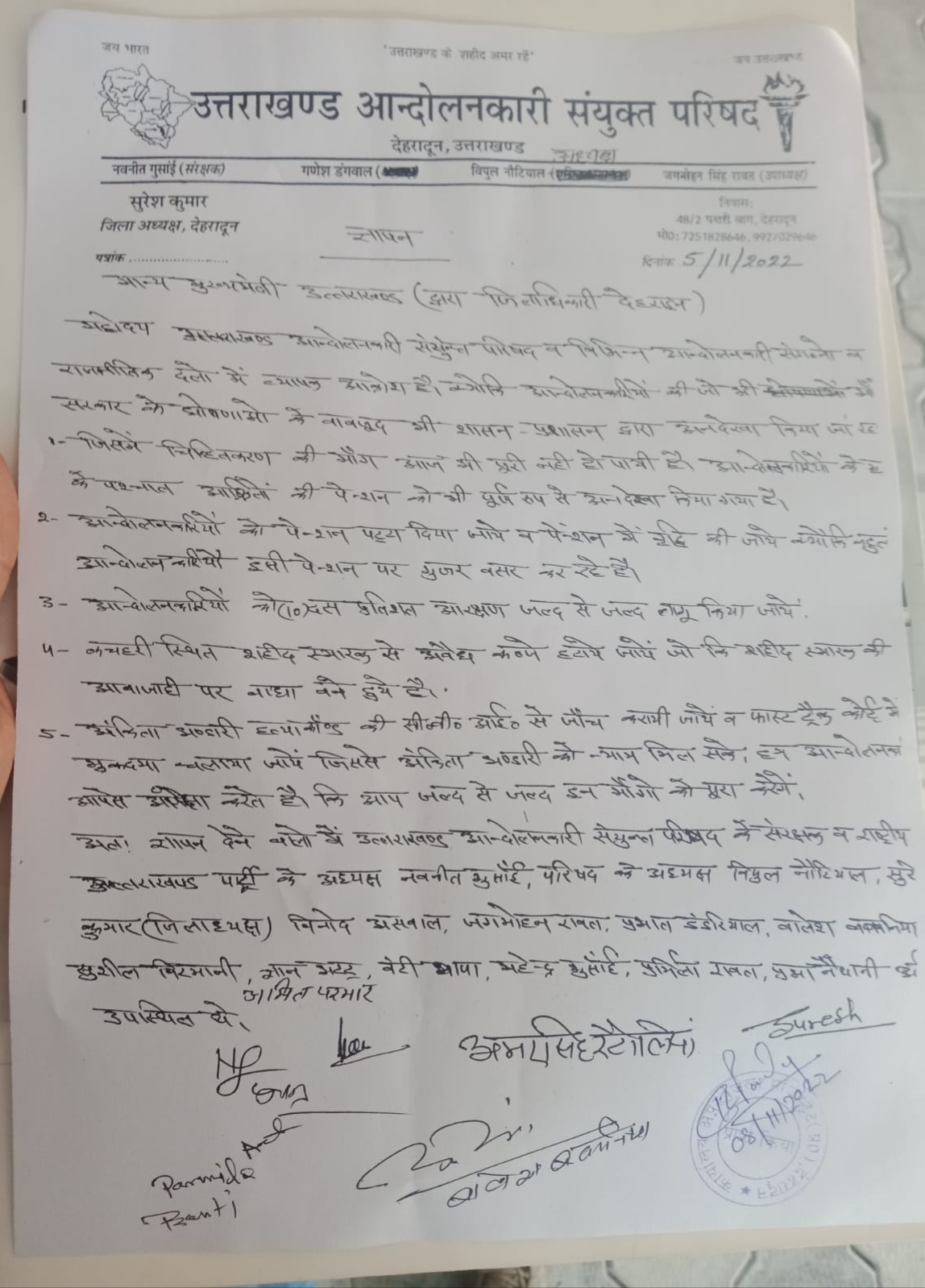 आंदोलनकारियों को पेंशन पट्टा दिया जाए व पेंशन में वृद्धि की जाए क्योंकि बहुत आंदोलन कार्य इसी पेंशन पर गुजर-बसर कर रहे हैं व आंदोलनकारियों को 10% आरक्षण जल्द से जल्द लागू किया जाए कचहरी स्थित शहीद स्मारक से अवैध कब्जे हटाए जाएं जो की शहीदी स्मारक की आवाजाही पर बाधा बने हुए हैं वाह अंकिता bhandari हत्याकांड की सीबीआई से जांच कराई जाए तथा फास्ट ट्रैक कोर्ट में मुकदमा चलाया जाए जिससे अंकिता bhandari को न्याय मिल सके हम आंदोलनकारी आपसे अपेक्षा करते हैं कि आप जल्द से जल्द इन मांगों को पूरा करेंगे