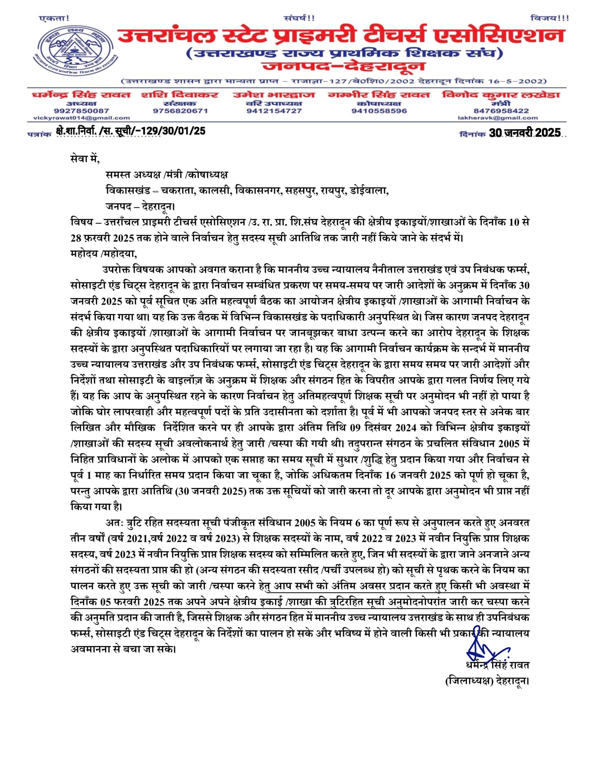 उत्तराँचल प्राइमरी टीचर्स एसोसिएशन /उत्तराखंड राज्य प्राथमिक शिक्षक संघ जनपद देहरादून की ब्लॉक स्तरीय कार्यकारिणी के चुनाव की घोषणा की गई