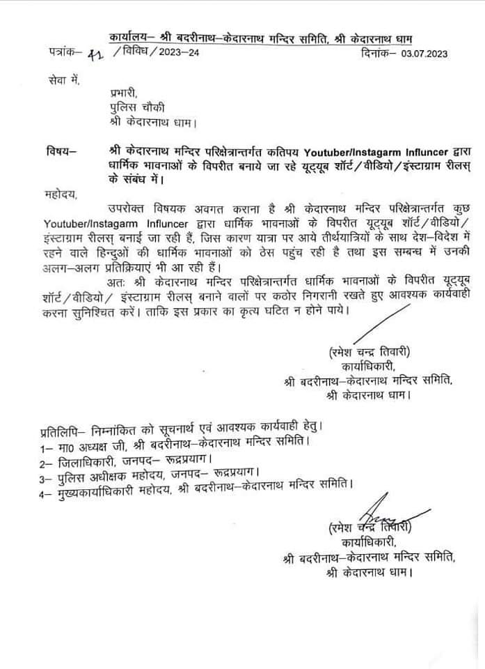 बदरी-केदार मंदिर समिति (बीकेटीसी) की ओर सेजारी बयान में कहा गया है कि समिति ने तय किया है कि केदारनाथ मंदिर परिक्षेत्र में धार्मिक भावनाओं के विपरीत यू-ट्यूब, शार्ट, वीडियो और रील बनाने वालों पर कड़ी निगरानी रखी जानी चाहिए। साथ ही वीडियो और रील बनाने वालों पर मुकदमा दर्ज किया जाना चाहिए, ताकि भविष्य में केदारनाथ धाम में इस तरह के कृत्य न हो सकें। उम्मीद है कि समिति के इस फैसले से धार्मिक मर्यादा के खिलाफ होने वाली घटनाओं पर लगाम लगेगी।