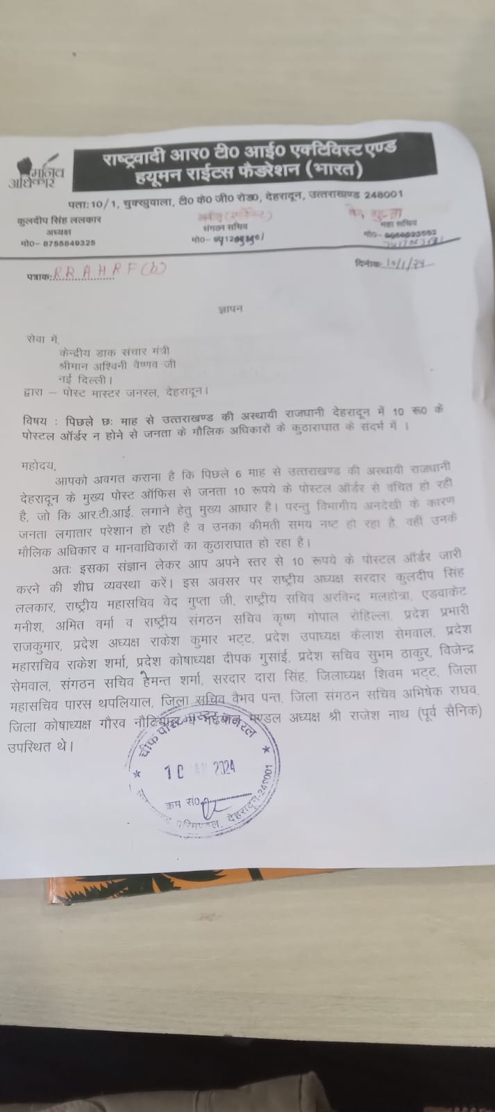 इसी क्रम में राष्ट्रवादी आर टी आई कार्यकर्ता एवम मानवाधिकार महासंघ भारत के पदाधिकारी व सदस्य घन्टाघर पोस्ट ऑफिस में एकत्र हुए और सेंट्रल मिनिस्टर को पोस्ट मास्टर जरनल के माध्यम से ज्ञापन दिया गया की