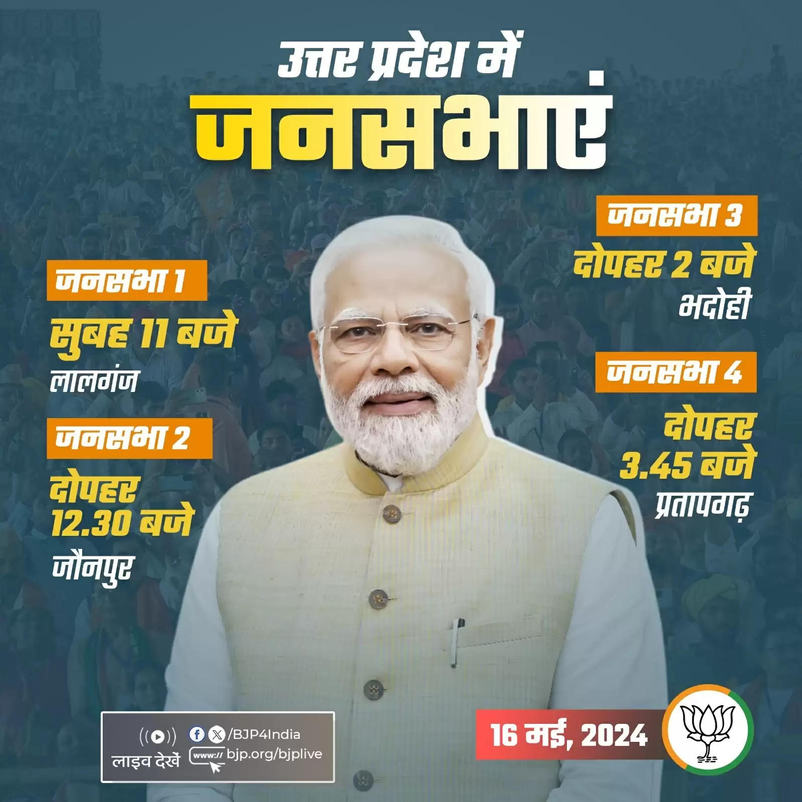 भाजपा के एक्स हैंडल के अनुसार प्रधानमंत्री मोदी आज सुबह 11 बजे लालगंज, दोपहर 12ः30 बजे जौनपुर, दो बजे भदोही और शाम होने से कुछ पहले पौने चार बजे प्रतापगढ़ में विशाल जनसभा को संबोधित करेंगे।