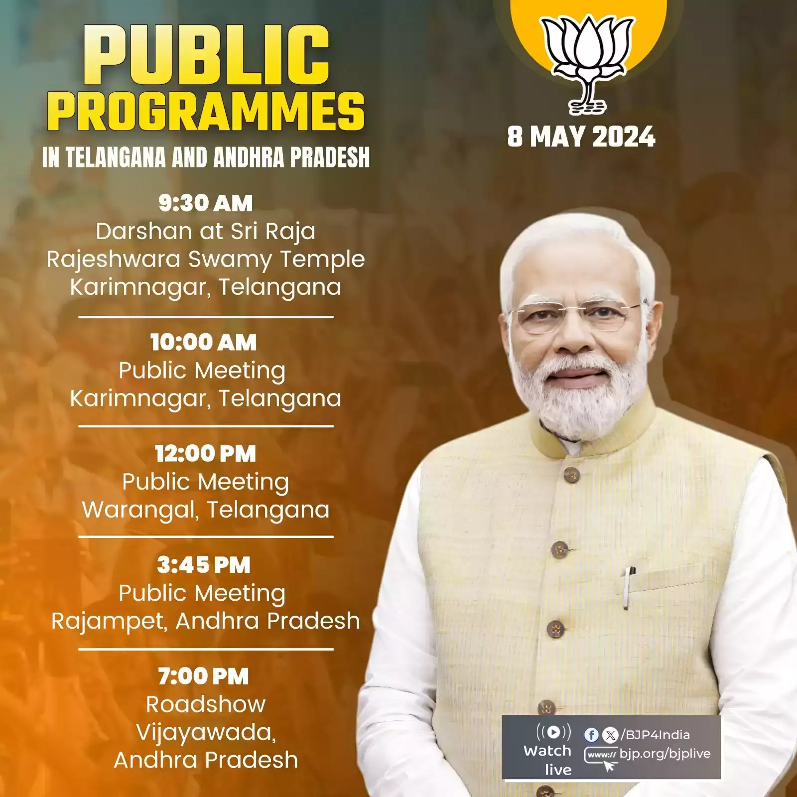 भाजपा के एक्स हैंडल के अनुसार प्रधानमंत्री मोदी आज सबसे पहले तेलंगाना में जनसभाओं को संबोधित करेंगे। प्रधानमंत्री मोदी सुबह 9:30 बजे सबसे पहले तेलंगाना के करीमनगर में राज राजेश्वर स्वामी मंदिर में पूजा-अर्चना करेंगे। इसके बाद 10 बजे करीम नगर में जनसभा को संबोधित करेंगे। यहां से दोपहर 12 बजे वारंगल पहुंचेंगे। वारंगल में वो विशाल जनसभा को संबोधित करेंगे। यहां के बाद वो आंध्र प्रदेश पहुंचेंगे। प्रधानमंत्री मोदी आंध्र प्रदेश के राजमपेट में अपराह्न 3:45 बजे जनसभा को संबोधित करेंगे। शाम सात बजे विजयवाड़ा में होने वाले रोड शो में हिस्सा लेंगे।