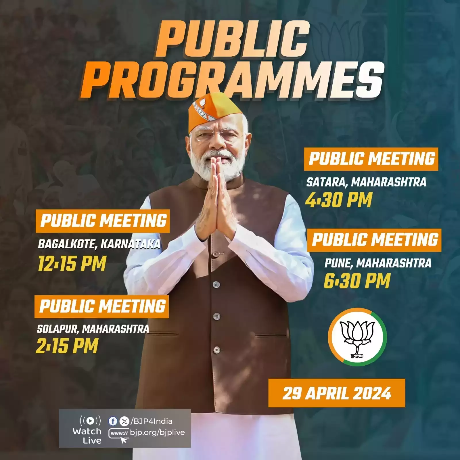 भाजपा के एक्स हैंडल के अनुसार, प्रधानमंत्री मोदी आज सबसे पहले कर्नाटक के बागलकोट में दोपहर 12 बजकर 15 मिनट पर भाजपा की जनसभा को संबोधित करेंगे। यहां से प्रधानमंत्री महाराष्ट्र के लिए रवाना होंगे। वो महाराष्ट्र में सर्वप्रथम सोलापुर की जनता के बीच जाएंगे। प्रधानमंत्री सोलापुर में दोपहर सवा दो बजे भारतीय जनता पार्टी के जनसभा को संबोधित करेंगे। इसके बाद प्रधानमंत्री सतारा पहुंचेंगे। यहां उनकी जनसभा शाम 4ः30 बजे होनी है। आखिर में प्रधानमंत्री मोदी पुणे पहुंचेंगे। यहां शाम साढ़े छह बजे भारतीय जनता पार्टी की विशाल जनसभा को संबोधित करेंगे।