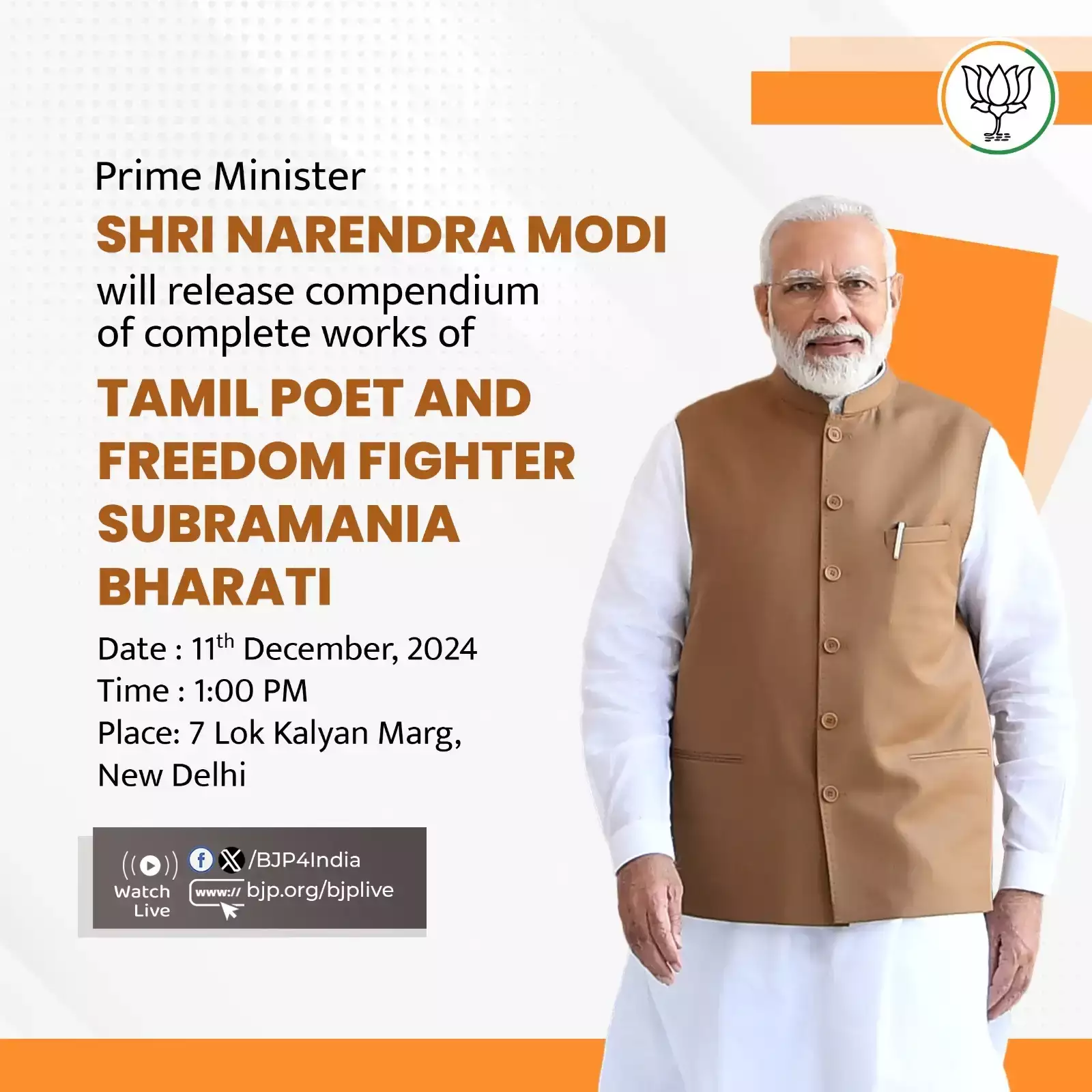 प्रधानमंत्री नरेन्द्र मोदी के आज दो महत्वपूर्ण कार्यक्रम हैं। वो आज महान तमिल कवि और स्वतंत्रता सेनानी सुब्रमण्यम भारती पर केंद्रित संग्रह को जारी करेंगे। साथ ही स्मार्ट इंडिया हैकथॉन-2024 के ग्रैंड फिनाले में युवा इनोवेटर्स के साथ वर्चुअली संवाद करेंगे। भारतीय जनता पार्टी (भाजपा) ने प्रधानमंत्री नरेन्द्र मोदी के आज के दोनों कार्यक्रमों की सूचना अपने एक्स हैंडल पर साझा की।भाजपा ने एक्स हैंडल पर लिखा, ”प्रधानमंत्री श्री नरेन्द्र मोदी 11 दिसंबर, 2024 को महान तमिल कवि और स्वतंत्रता सेनानी सुब्रमण्यम भारती के संपूर्ण कार्यों का एक संग्रह जारी करेंगे।” यह कार्यक्रम दोपहर एक बजे सात कल्याण लोक मार्ग पर होगा। भाजपा ने एक्स हैंडल पर दूसरी पोस्ट में सूचित किया, ”प्रधानमंत्री श्री नरेन्द्र मोदी 11 दिसंबर, 2024 को स्मार्ट इंडिया हैकथॉन-2024 के ग्रैंड फिनाले में युवा इनोवेटर्स के साथ वर्चुअली बातचीत करेंगे।” यह कार्यक्रम शाम साढ़े चार बजे होगा।भारत सरकार के पत्र एवं सूचना कार्यालय (पीआईबी) की एक विज्ञप्ति के अनुसार, ग्रैंड फिनाले में देशभर के 51 नोडल केंद्रों पर 1300 से अधिक विद्यार्थियों की टीमें भाग लेंगी। स्मार्ट इंडिया हैकथॉन का यह सातवां संस्करण है। इसका सॉफ्टवेयर संस्करण 36 घंटे तक लगातार चलेगा।हार्डवेयर संस्करण आज से से 15 दिसंबर तक जारी रहेगा। इस वर्ष का संस्करण कुछ खास है। इसकी विषय वस्तु में इसरो के ‘चंद्रमा पर अंधेरे वाले क्षेत्रों के चित्रों को बढ़ाना’, जल शक्ति मंत्रालय के ‘एआई, उपग्रह डेटा, आईओटी एवं गतिशील मॉडल का उपयोग करके वास्तविक समय में गंगा जल की गुणवत्ता की निगरानी प्रणाली विकसित करना’ और आयुष मंत्रालय के ‘एआई के साथ एकीकृत एक स्मार्ट योगा मैट विकसित करना’ समाहित किया गया है।