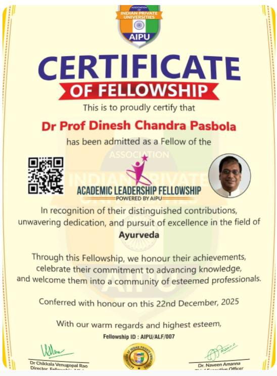 एसोसिएशन ऑफ इंडियन प्राइवेट यूनिवर्सिटीज (AIPU), गाजियाबाद , उत्तर प्रदेश, भारत द्वारा आयुर्वेद विभाग, उत्तराखंड के दो वरिष्ठ, काबिल एवं अनुभवी आयुर्वेद चिकित्सा अधिकारियों डॉ० प्रो० डी० सी० पसबोला और डॉ० अजय चमोला को “फेलोशिप इन आयुर्वेद (FAIPU)” उपाधि सम्मान प्रदान किया गया है। जिसके डाइरेक्टर, फेलोशिप अफेयर्स – डॉ० सी० वेणुगोपाल राव एवं चीफ एक्जीक्यूटिव आफिसर – डॉ० नवीन अमन्ना हैं
