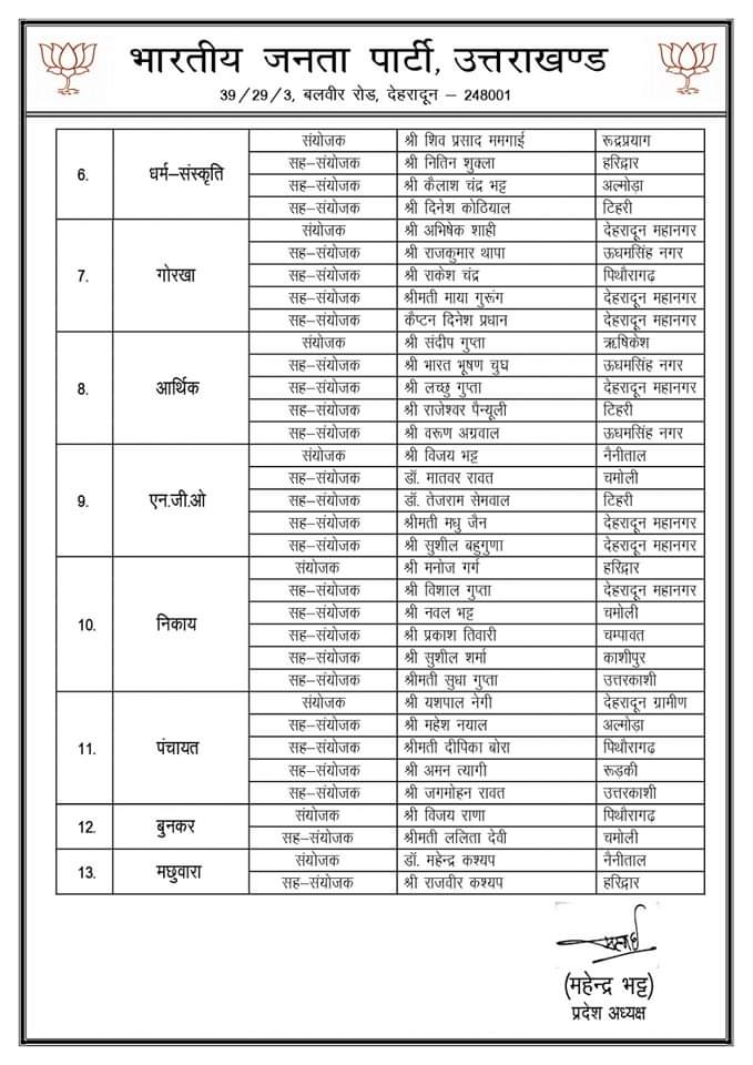 भाजपा ने प्रदेश में विभिन्न प्रकोष्ठों की घोषणा कर दी है। प्रदेश मीडिया प्रभारी मनवीर सिंह चौहान ने कहा है कि प्रदेश अध्यक्ष महेंद्र भट्ट के निर्देश पर विभिन्न प्रकोष्ठों मे संयोजक और सह संयोजकों की सूची जारी कर दी गयी है। चौहान ने बताया कि पार्टी द्वारा 17 में से 13 प्रकोष्ठों की घोषणा की गई है। अन्य चार प्रकोष्ठों की घोषणा बाद में की जाएगी।