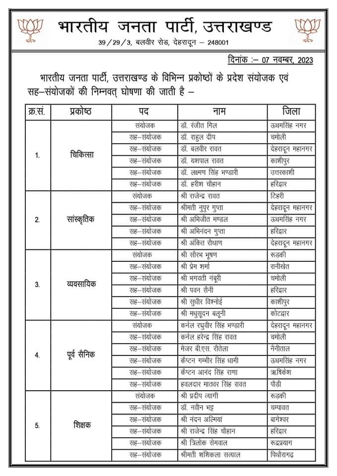 उत्तराखंड भाजपा ने की प्रकोष्ठों की घोषणा, चम्पावत के प्रकाश तिवारी बनाए गए निकाय प्रकोष्ठ के सह संयोजक